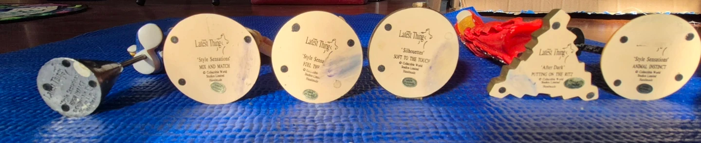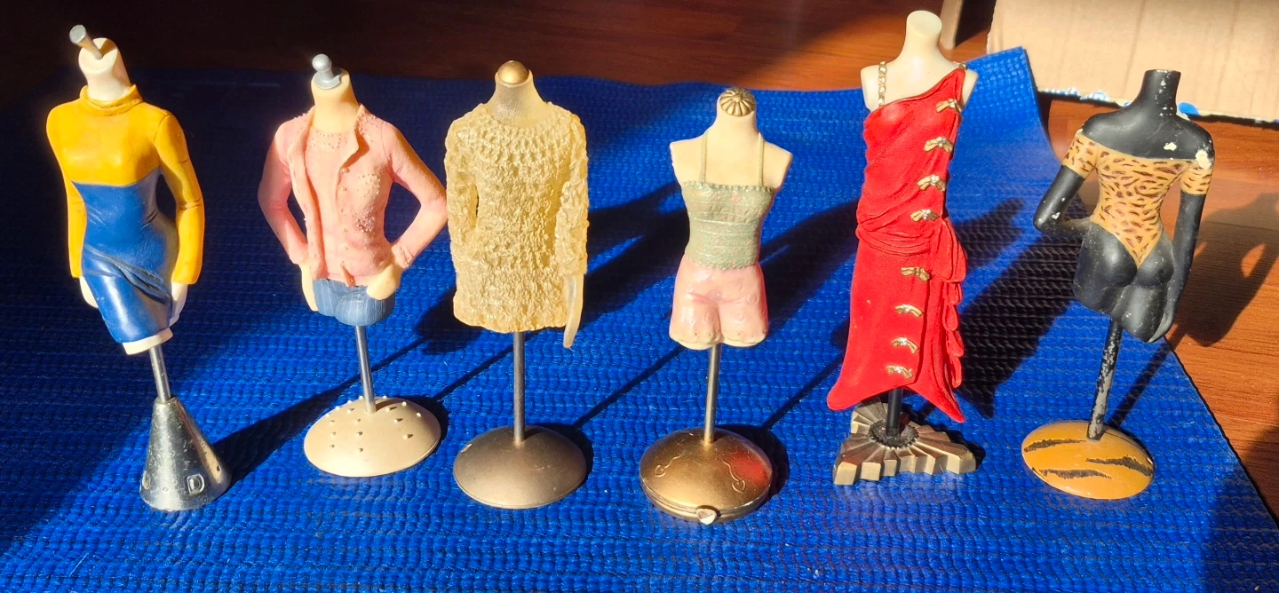 Selling a set of six miniature mannequins from Latest Things. Each one has a unique outfit and design. They are in used condition and would be a cute addition to any collection or display!
