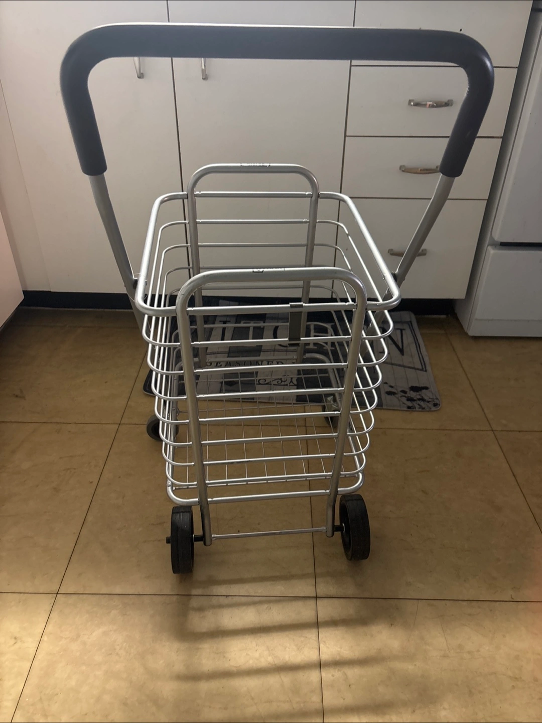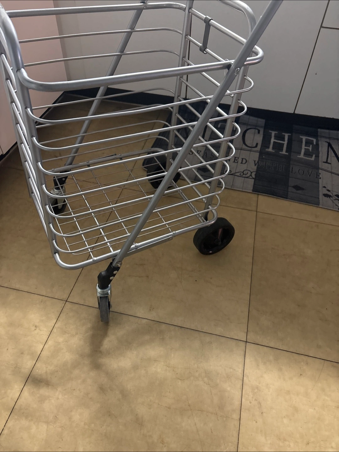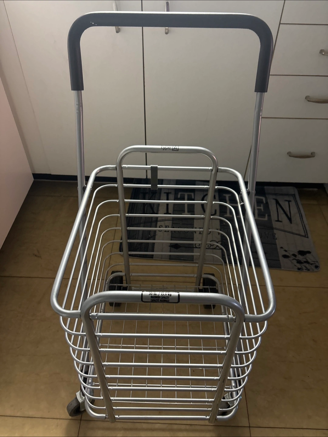 Selling a Type A folding shopping cart. It's in great shape and ready to help with your grocery runs or trips to the market. It has a maximum capacity of 30 lb / 13.6 kg.