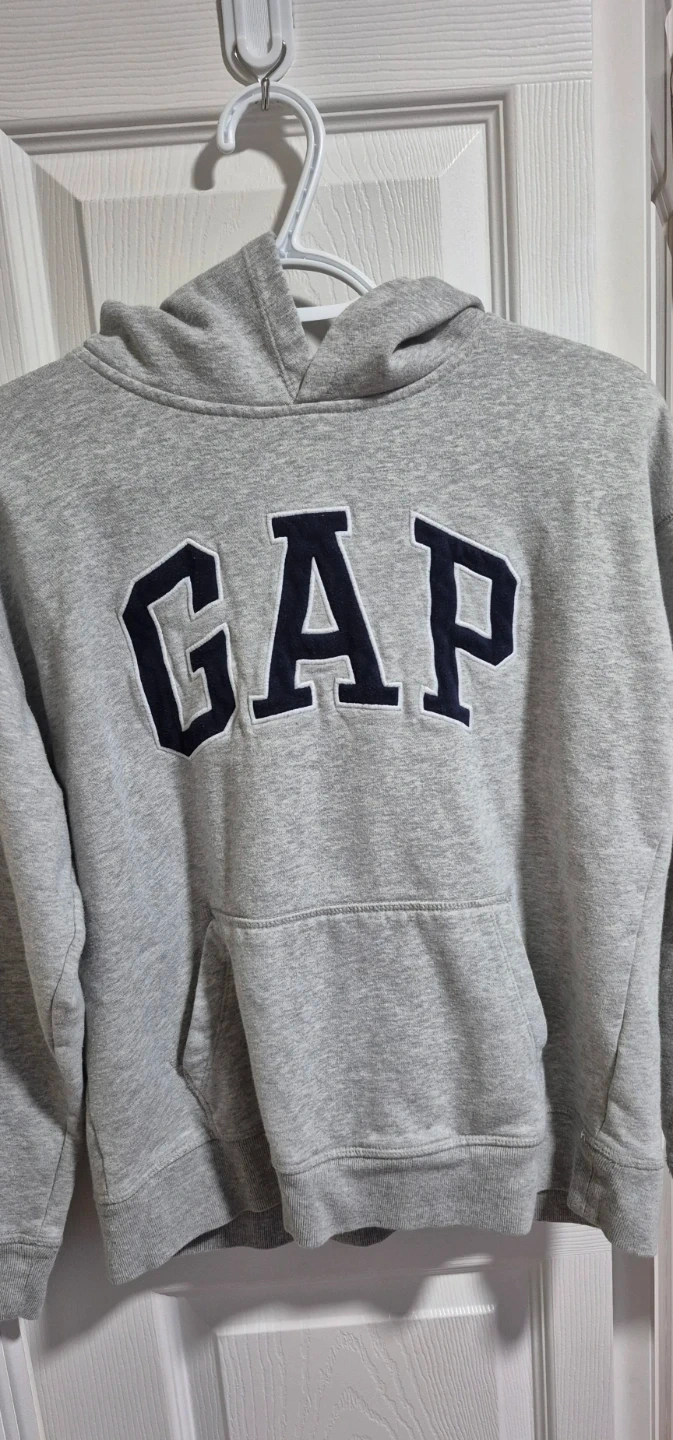 This is a GAP Kids grey hoodie. It's a size XXL TTG, which fits a 14-16 range. Made in Indonesia. It's a comfortable pullover style with a front pocket and hood.