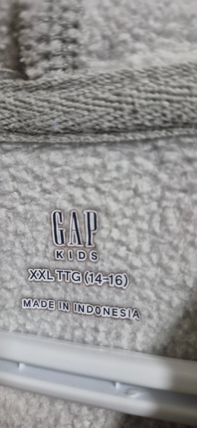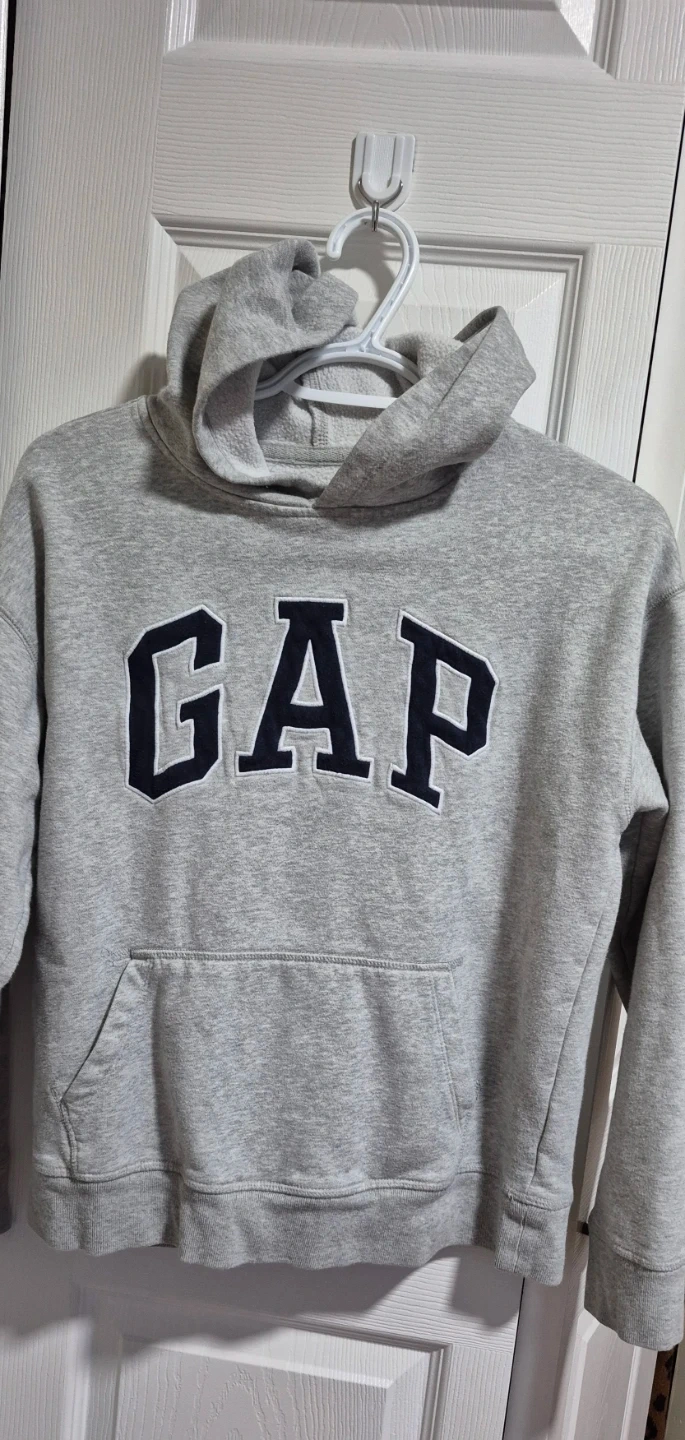 This is a GAP Kids grey hoodie. It's a size XXL TTG, which fits a 14-16 range. Made in Indonesia. It's a comfortable pullover style with a front pocket and hood.
