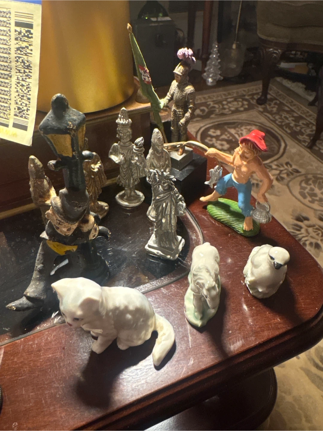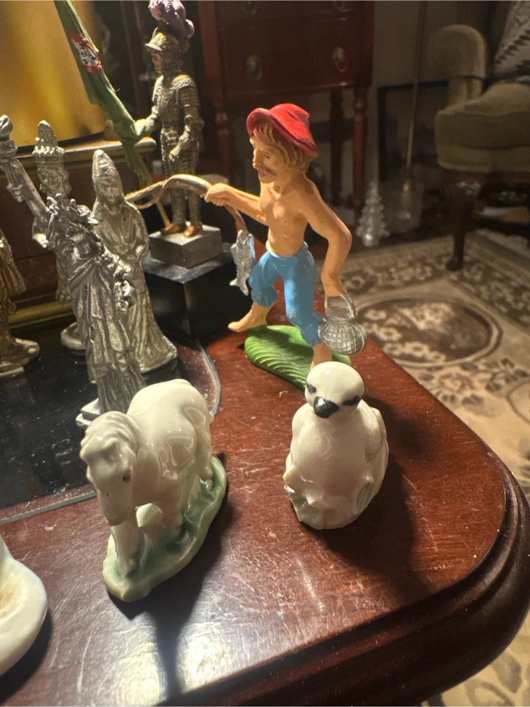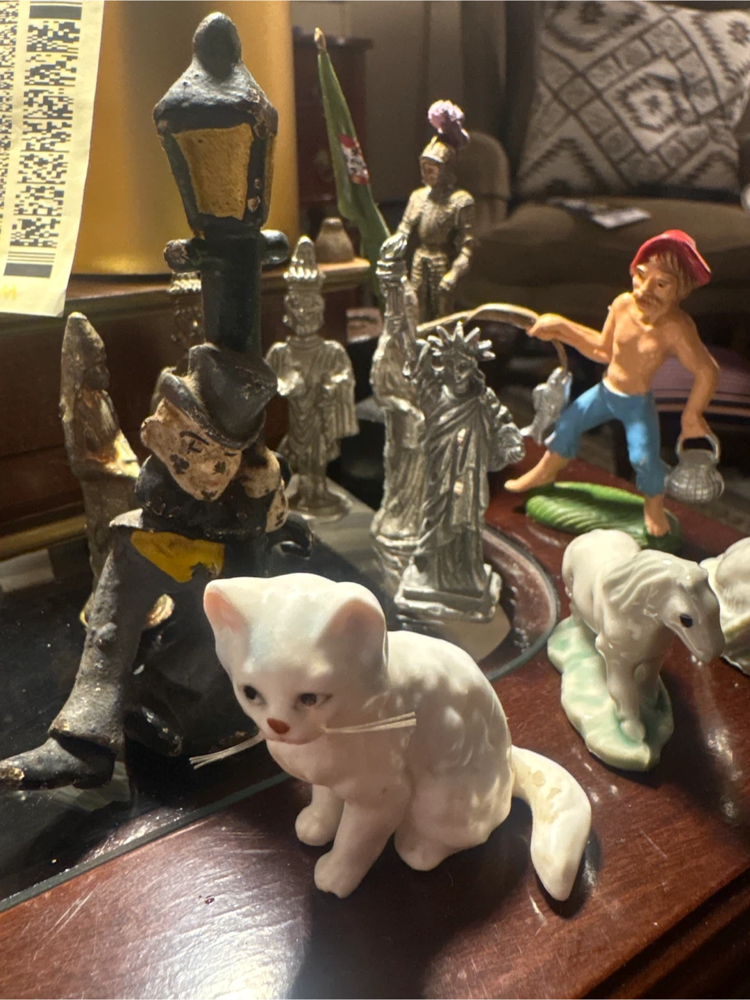 A collection of assorted figurines including a white cat, a fisherman, a lamppost, and several historical/architectural figures. These decorative pieces add a touch of charm to any space. They're great for display on shelves or tables. Metal and porcelain, plastic and cat iron