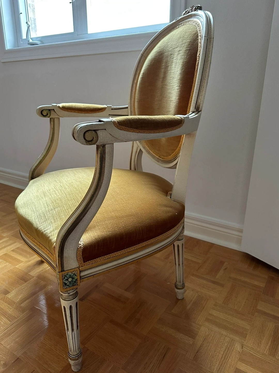 Stunning Louis XV style armchair featuring a hand-carved cream-colored wood frame and original gold/mustard velvet upholstery. Elegant cabriole legs and ornate floral crest carving.