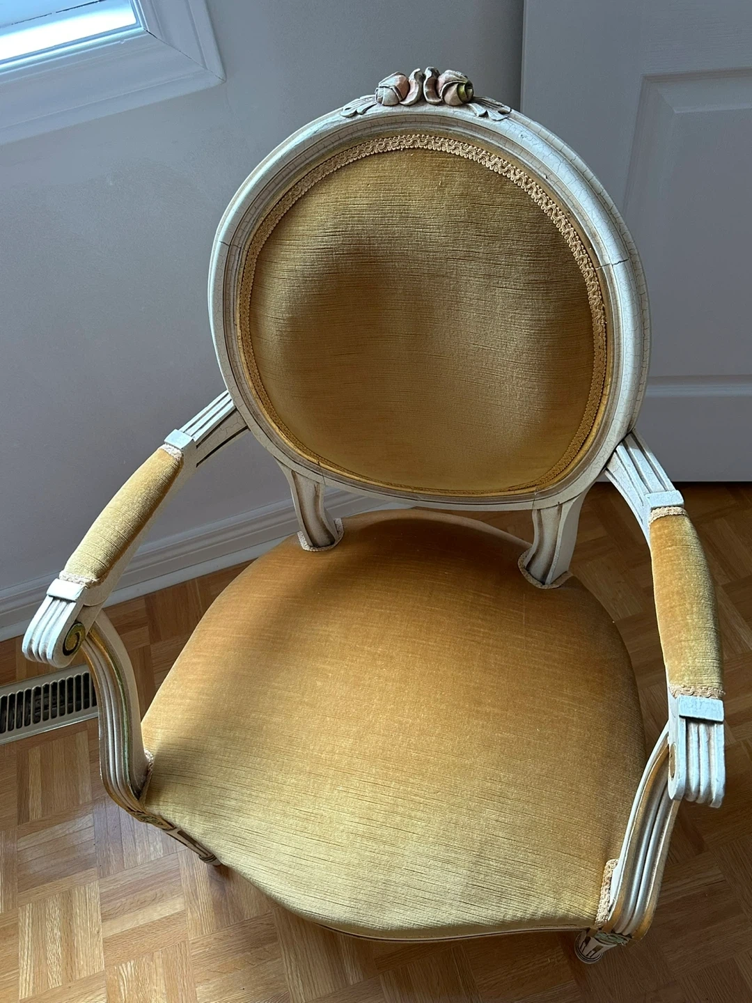 Stunning Louis XV style armchair featuring a hand-carved cream-colored wood frame and original gold/mustard velvet upholstery. Elegant cabriole legs and ornate floral crest carving.