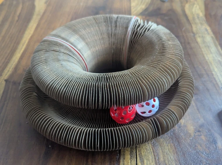 This fun cat tunnel is made from durable corrugated cardboard. It's designed to be foldable for easy storage. It includes two rattling balls, one red and one white, to keep your feline friend entertained. This toy is great for play and exploration!