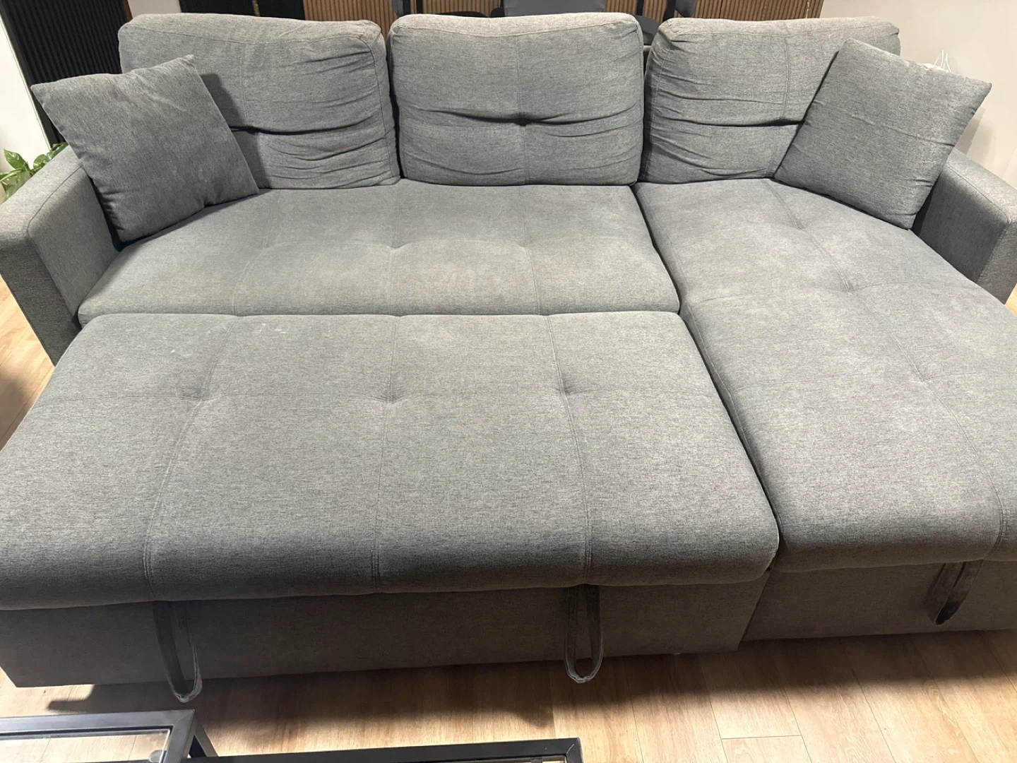 This grey sectional sofa easily converts into a bed, offering a great sleeping solution. It also features convenient storage space underneath. The material is a durable fabric, and it comes with matching throw pillows.