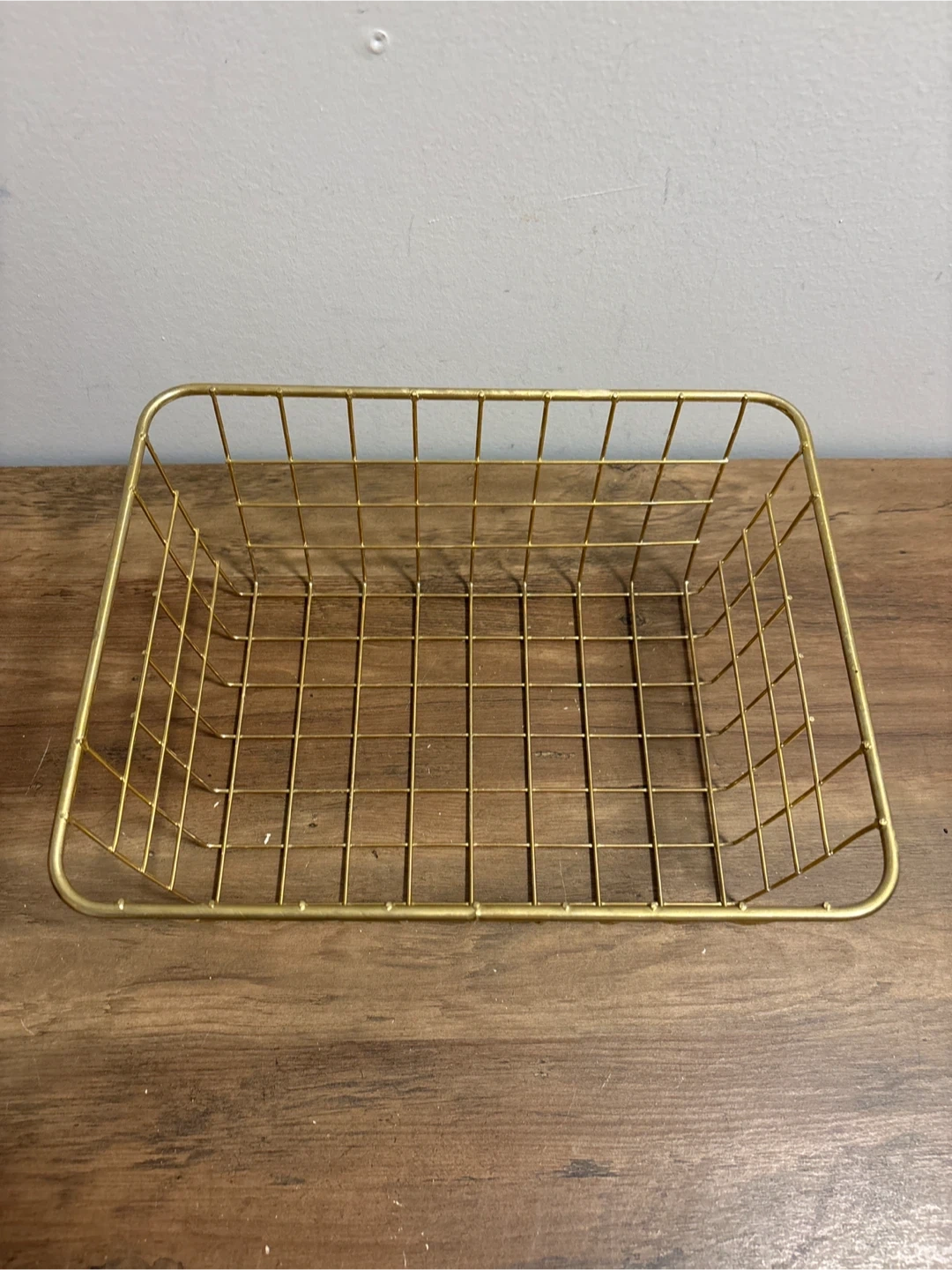 This gold wire basket is a handy organizer. It's made of metal wire with a grid pattern. It would be useful for storing small items on shelves or countertops.