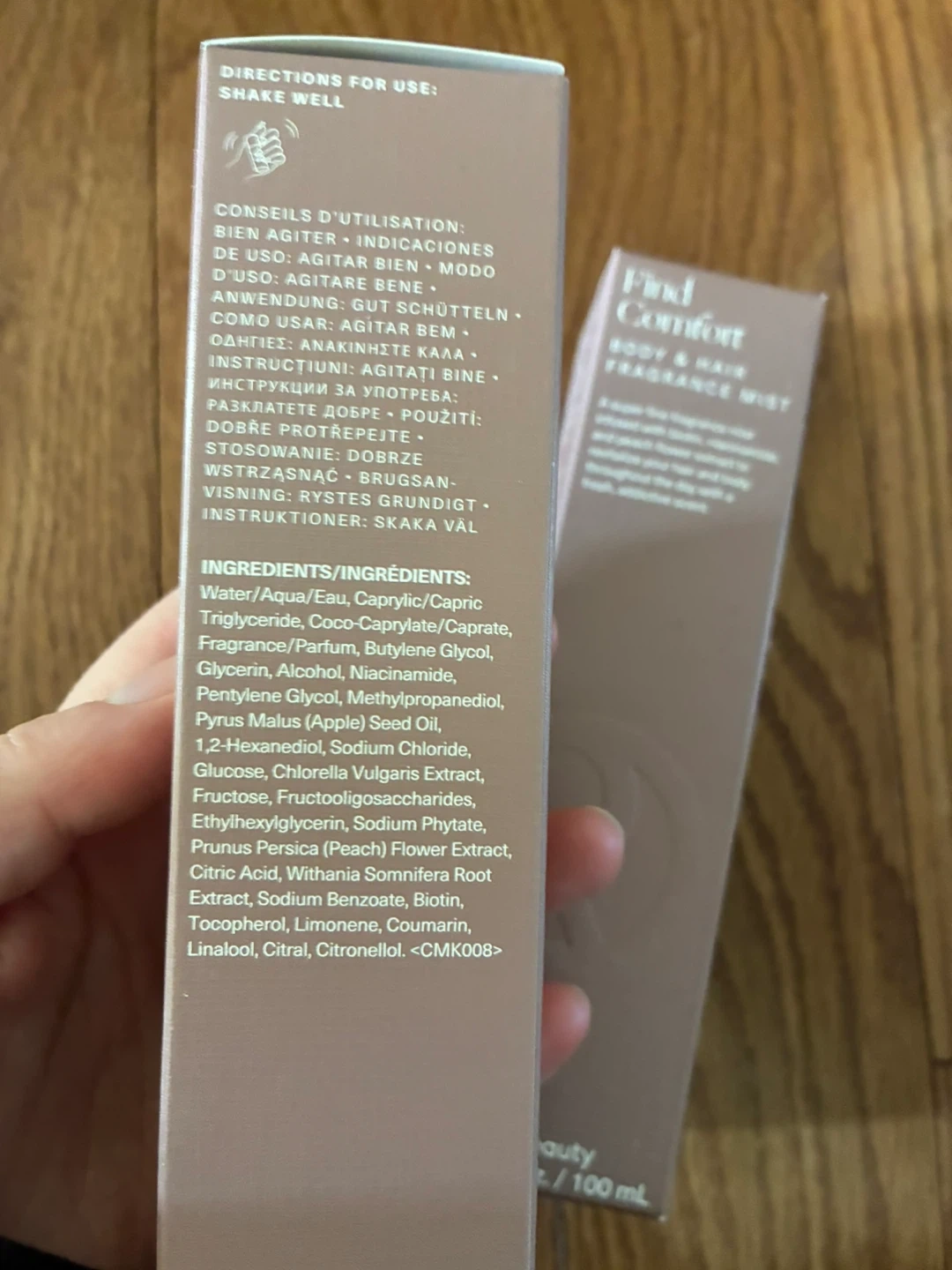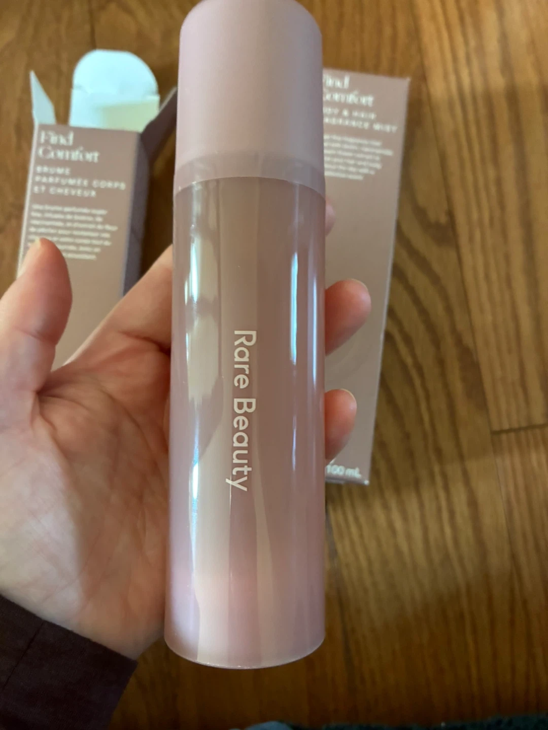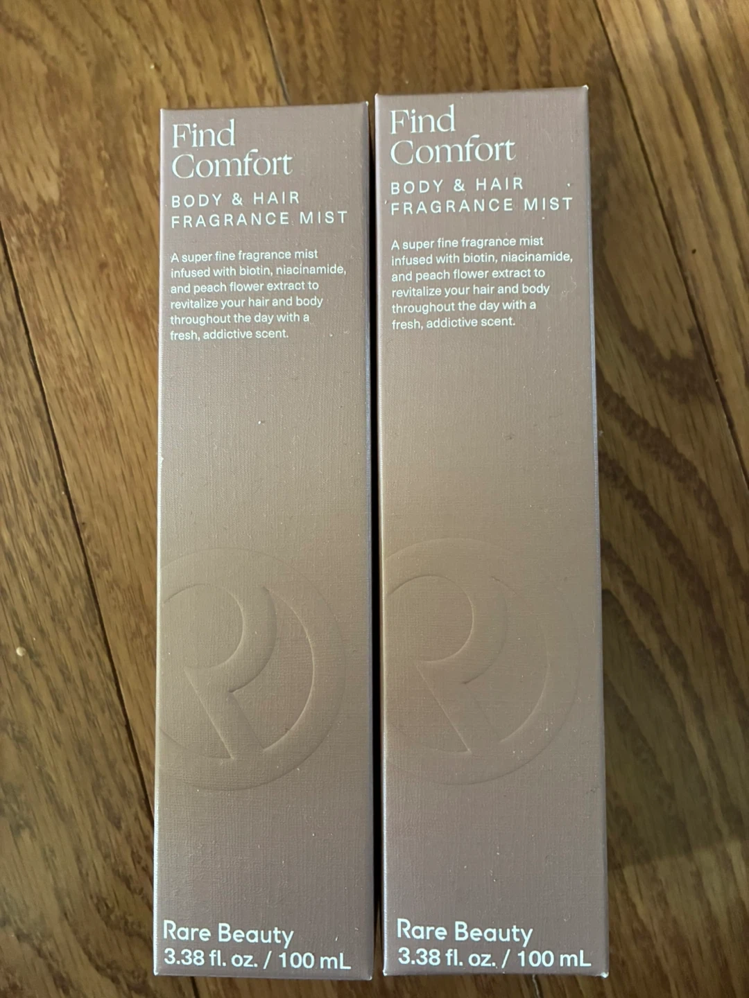 Rare Beauty Find Comfort Body & Hair Fragrance Mist. Infused with biotin, niacinamide, and peach flower extract. Revitalizes hair and body throughout the day with a fresh, addictive scent. 100 ml / 3.38 fl. oz.