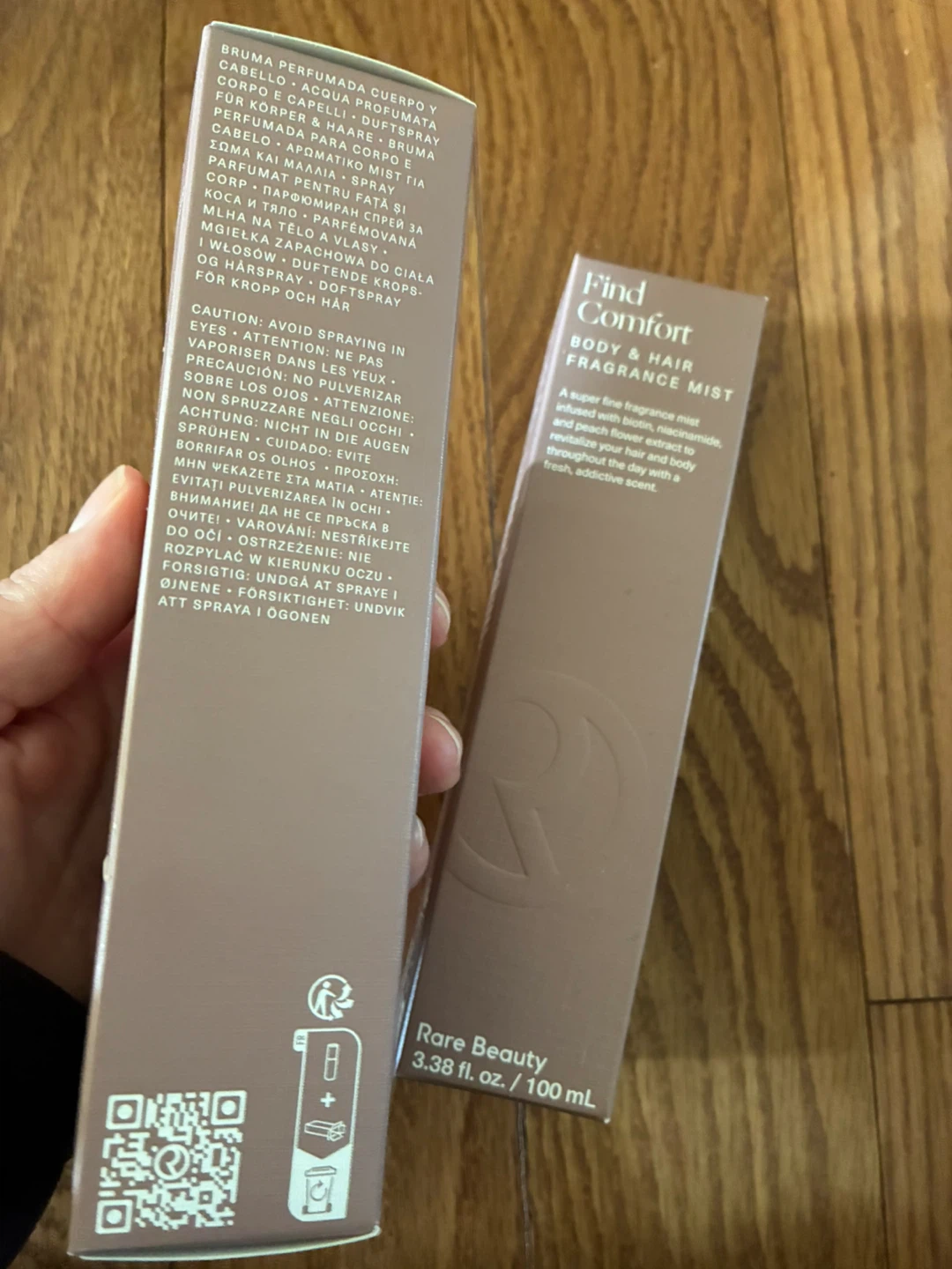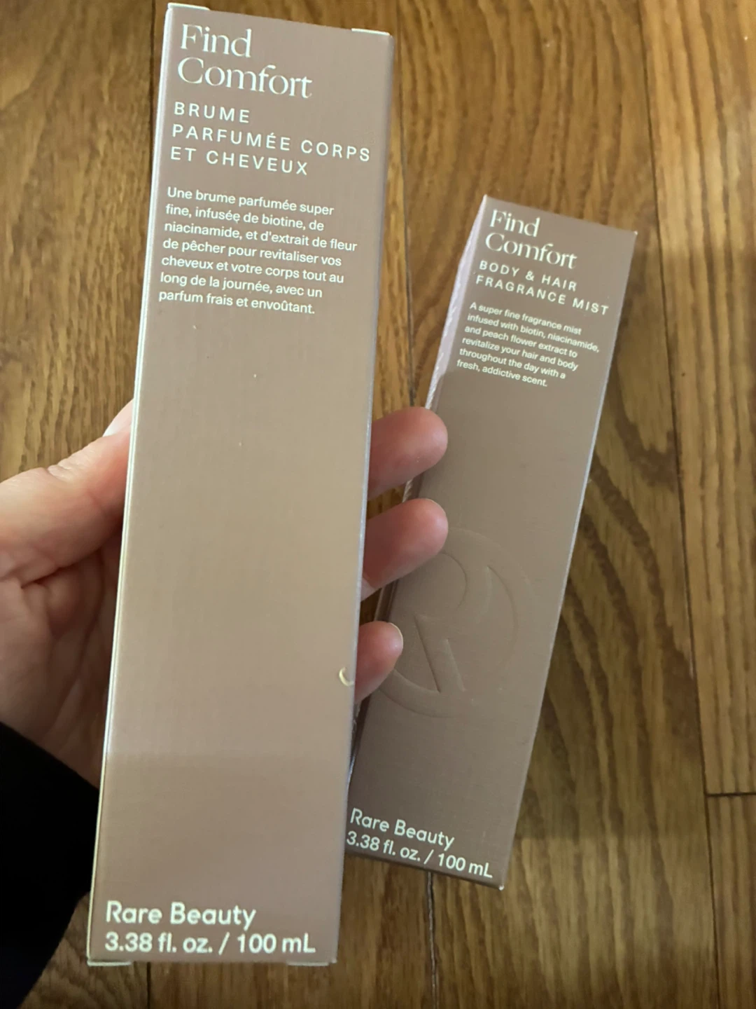 Rare Beauty Find Comfort Body & Hair Fragrance Mist. Infused with biotin, niacinamide, and peach flower extract. Revitalizes hair and body throughout the day with a fresh, addictive scent. 100 ml / 3.38 fl. oz.