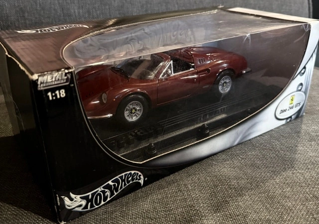 This Hot Wheels 1:18 scale diecast model of the Ferrari Dino 246 GTS is a stunning collector's item. While the box shows some wear and tear, the car itself is in excellent condition, securely displayed within its original packaging. A must-have for diecast car enthusiasts and Ferrari aficionados alike.