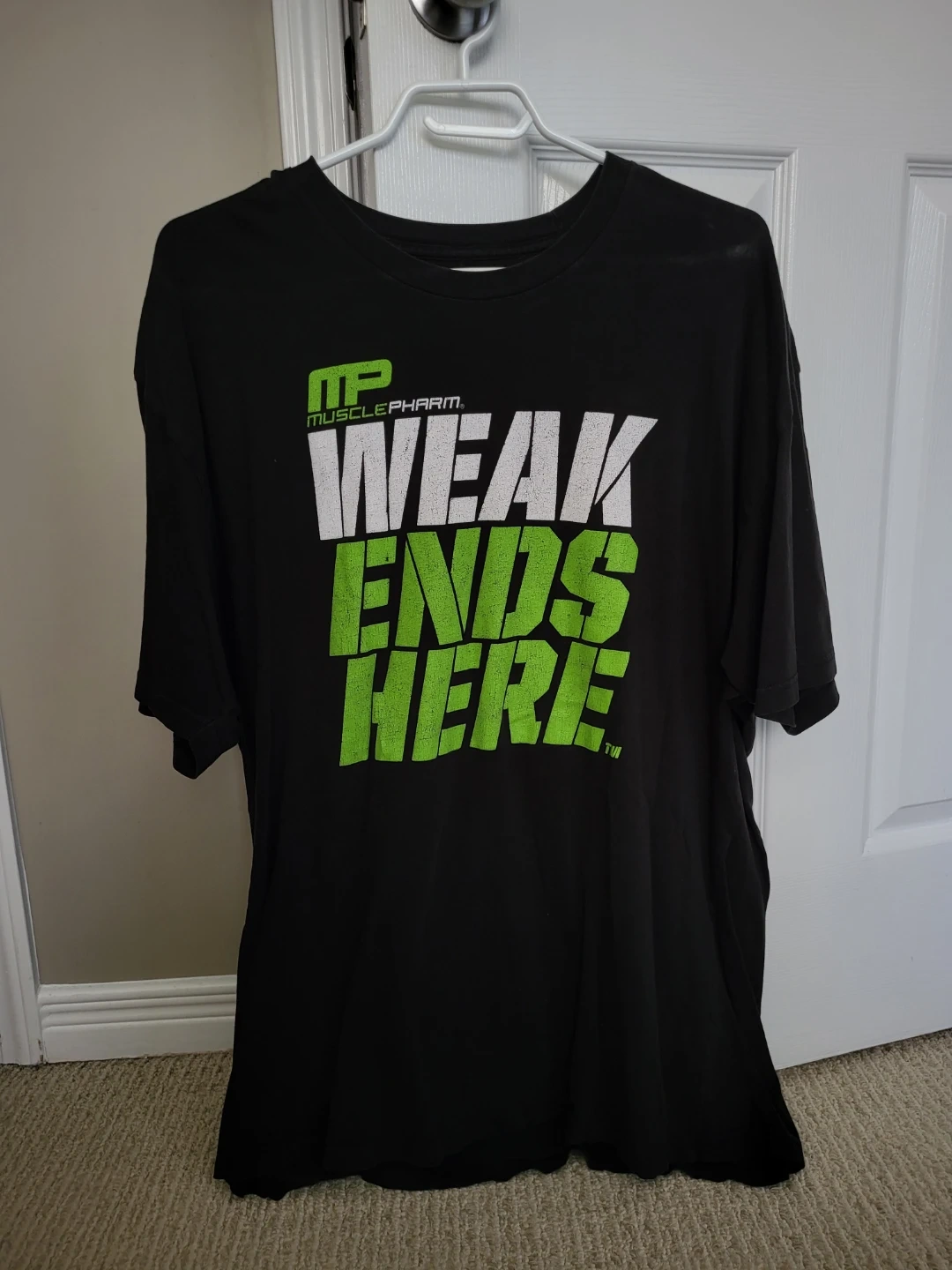 Black MusclePharm t-shirt with "Weak Ends Here" graphic. It's size XXL and made of 100% cotton. This shirt is for anyone who's hitting the gym! Small hole by neckline