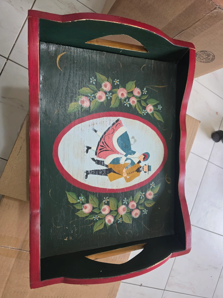 Beautiful serving tray. Decorated with a folk-art painting of a couple ice skating. Wooden tray with dark green surface. Red trim. A perfect addition to your home for your next tea party.