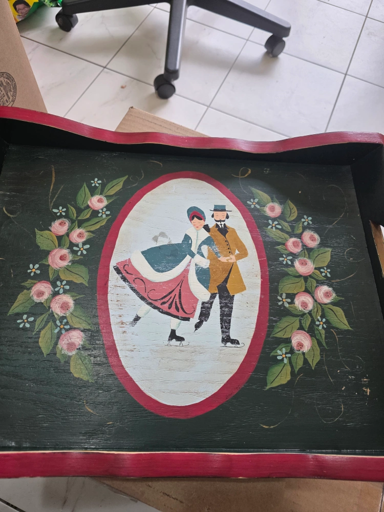 Beautiful serving tray. Decorated with a folk-art painting of a couple ice skating. Wooden tray with dark green surface. Red trim. A perfect addition to your home for your next tea party.