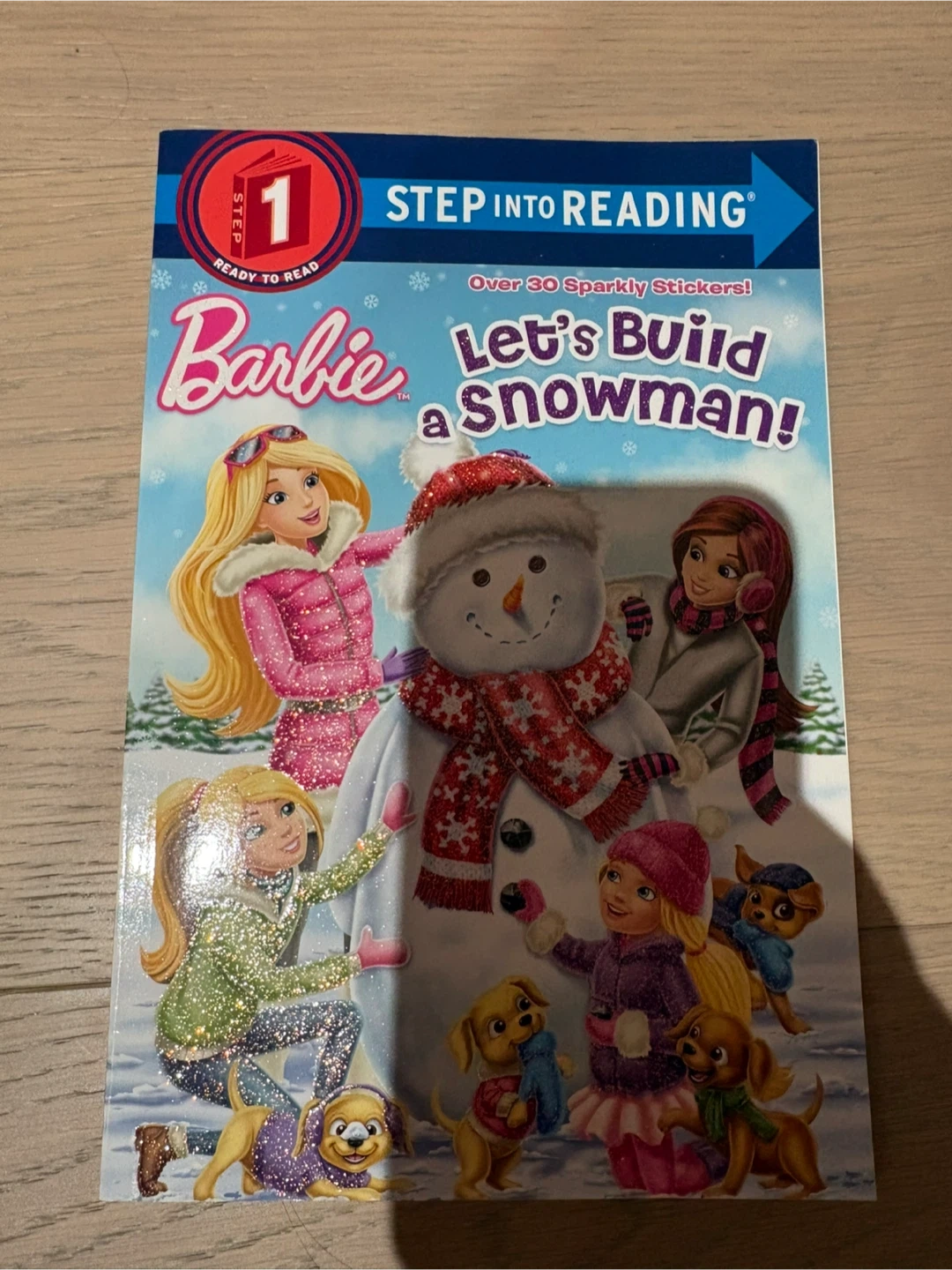 Barbie "Let's Build a Snowman!" is a Step 1 Step Into Reading book, perfect for preschoolers learning to read. It features sparkly stickers for extra fun. Only one sticker was removed. This book is great for young children just starting their reading journey!