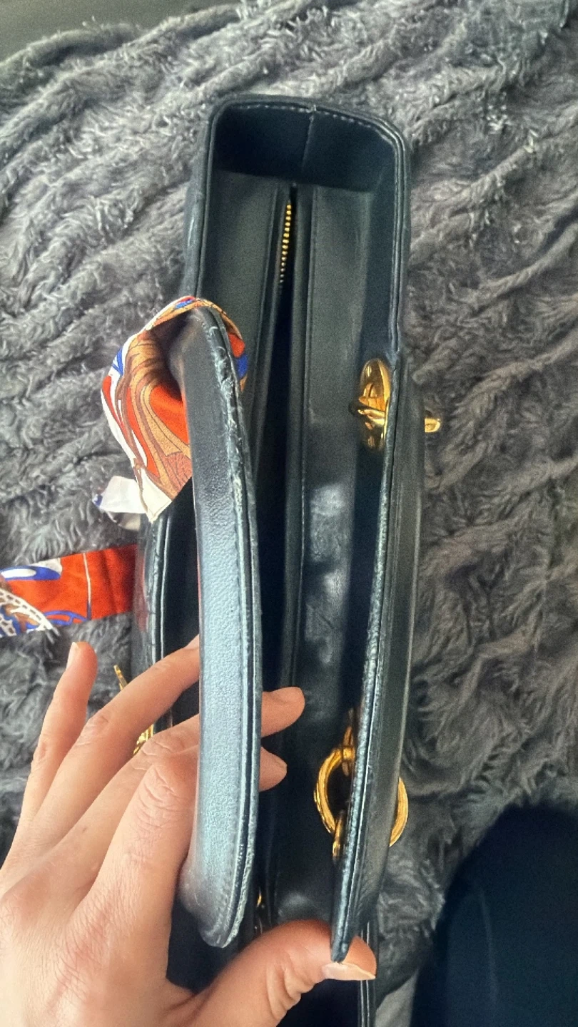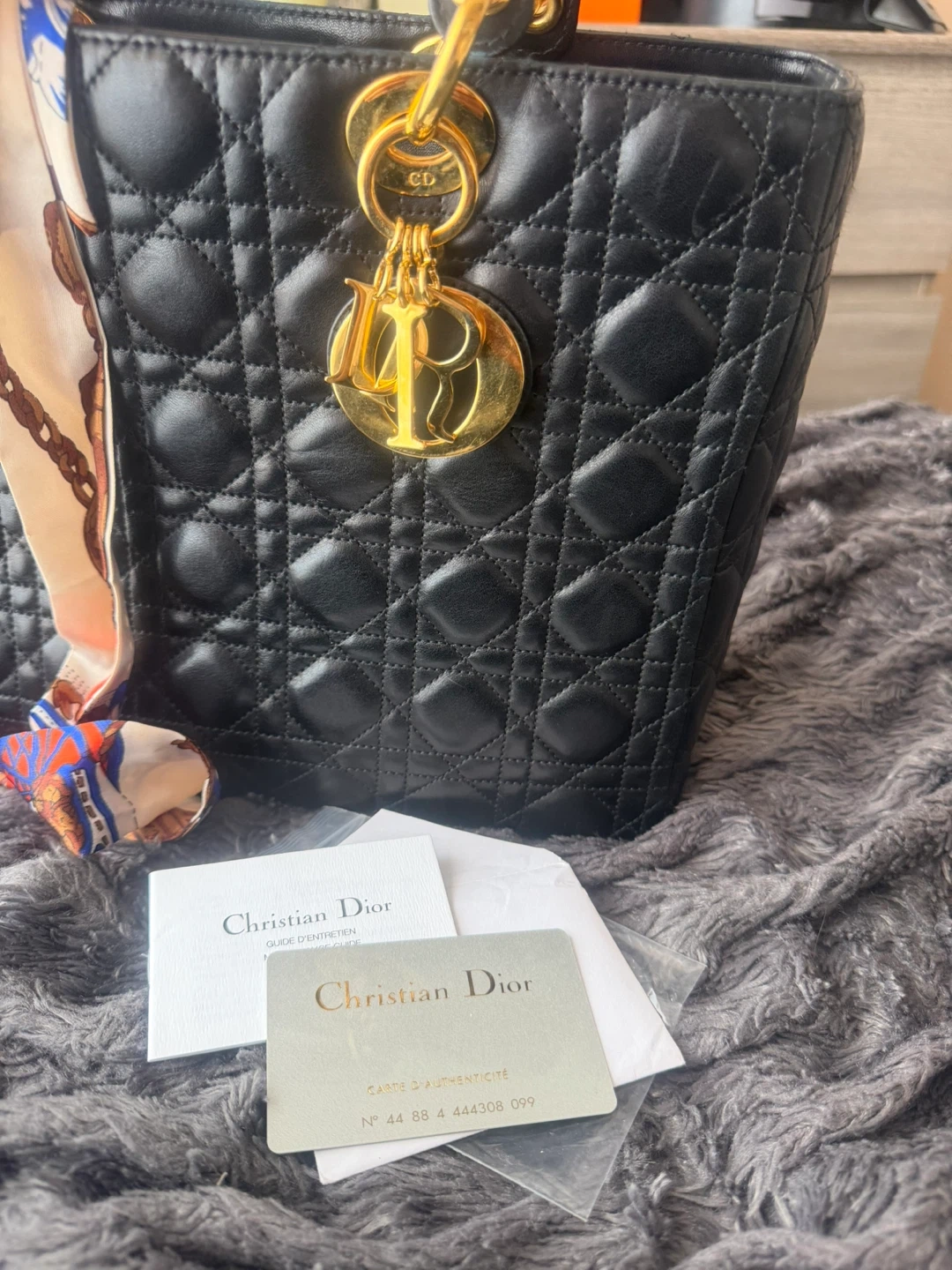 Classic black quilted leather Lady Dior handbag with gold-tone hardware and scarf accent on the handle. Includes authenticity card & dustbag with no sling.Lamb skin.