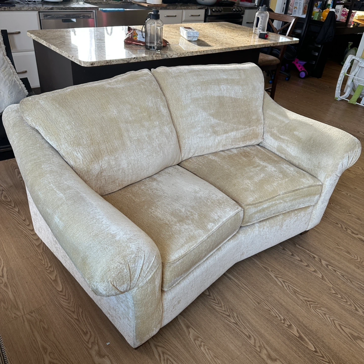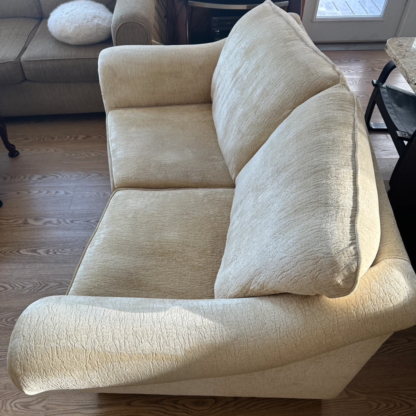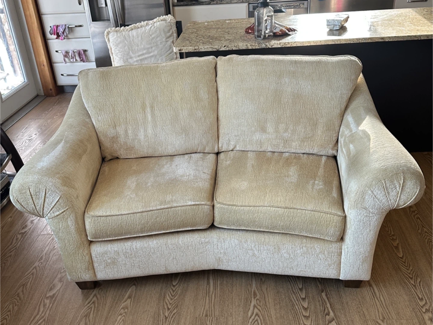 Comfortable and stylish loveseat sofa with soft chenille fabric upholstery. Neutral beige color that fits easily into any living room decor. The back is slightly angled for extra comfort, making it perfect for lounging.