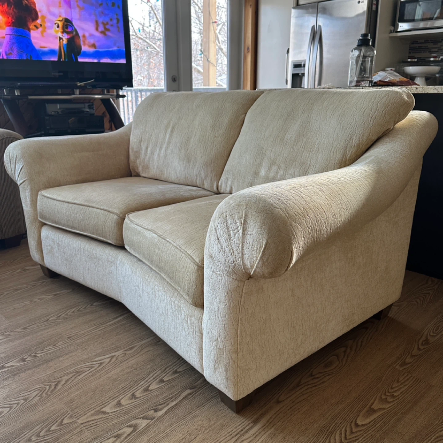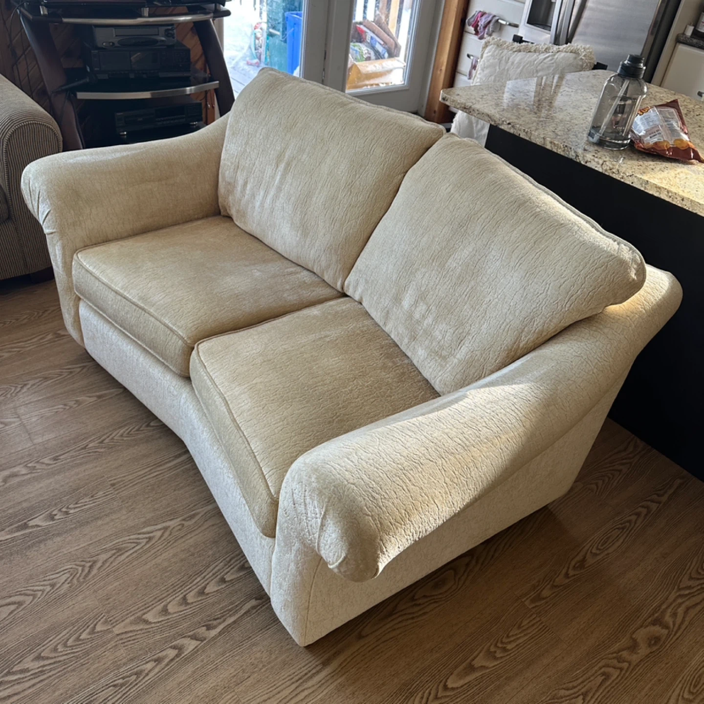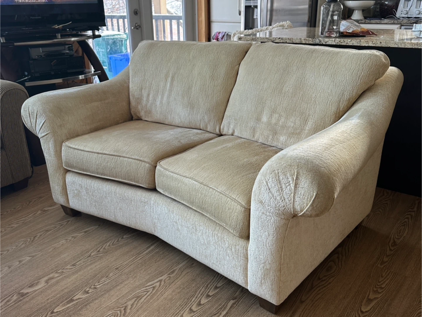 Comfortable and stylish loveseat sofa with soft chenille fabric upholstery. Neutral beige color that fits easily into any living room decor. The back is slightly angled for extra comfort, making it perfect for lounging.