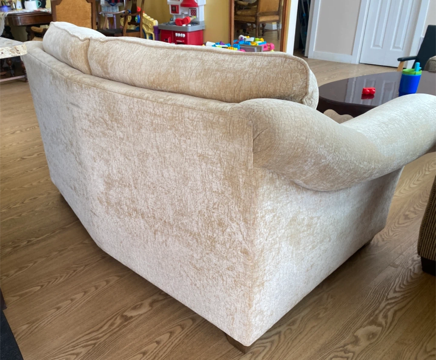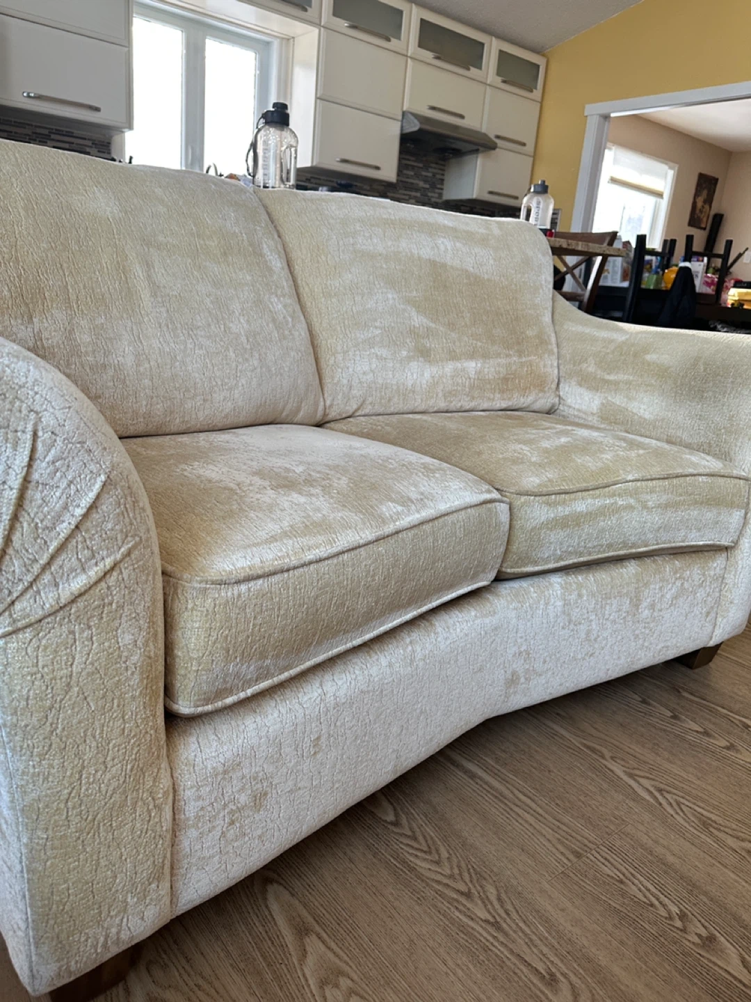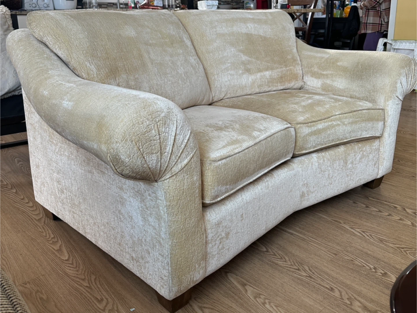 Comfortable and stylish loveseat sofa with soft chenille fabric upholstery. Neutral beige color that fits easily into any living room decor. The back is slightly angled for extra comfort, making it perfect for lounging.