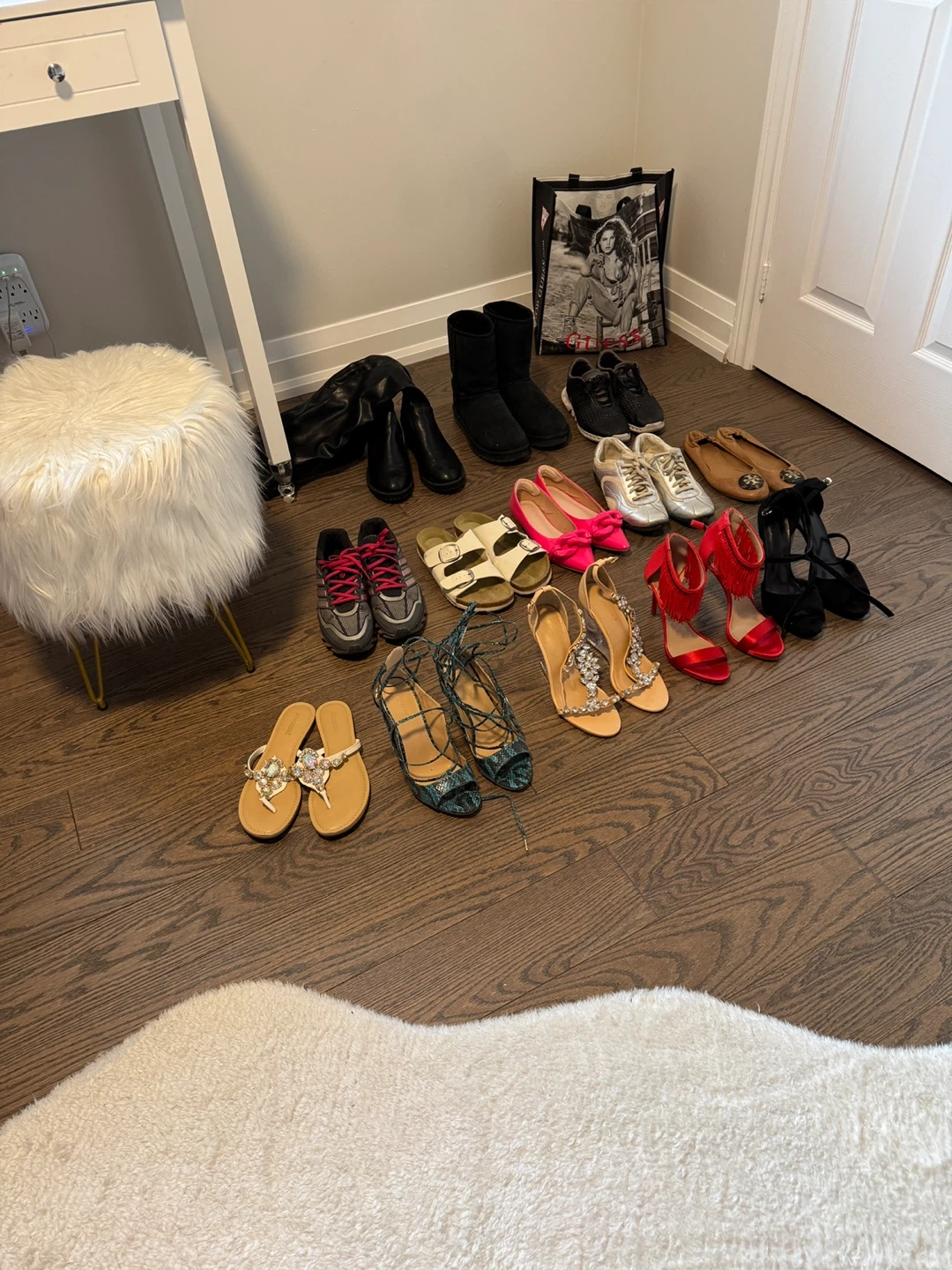 These black suede ankle strap heels are a stylish addition to any outfit. They feature a peep toe design and a buckle closure for a secure fit. Heel height is approximately 4 inches. This pair is a size US 10 or EU 41.