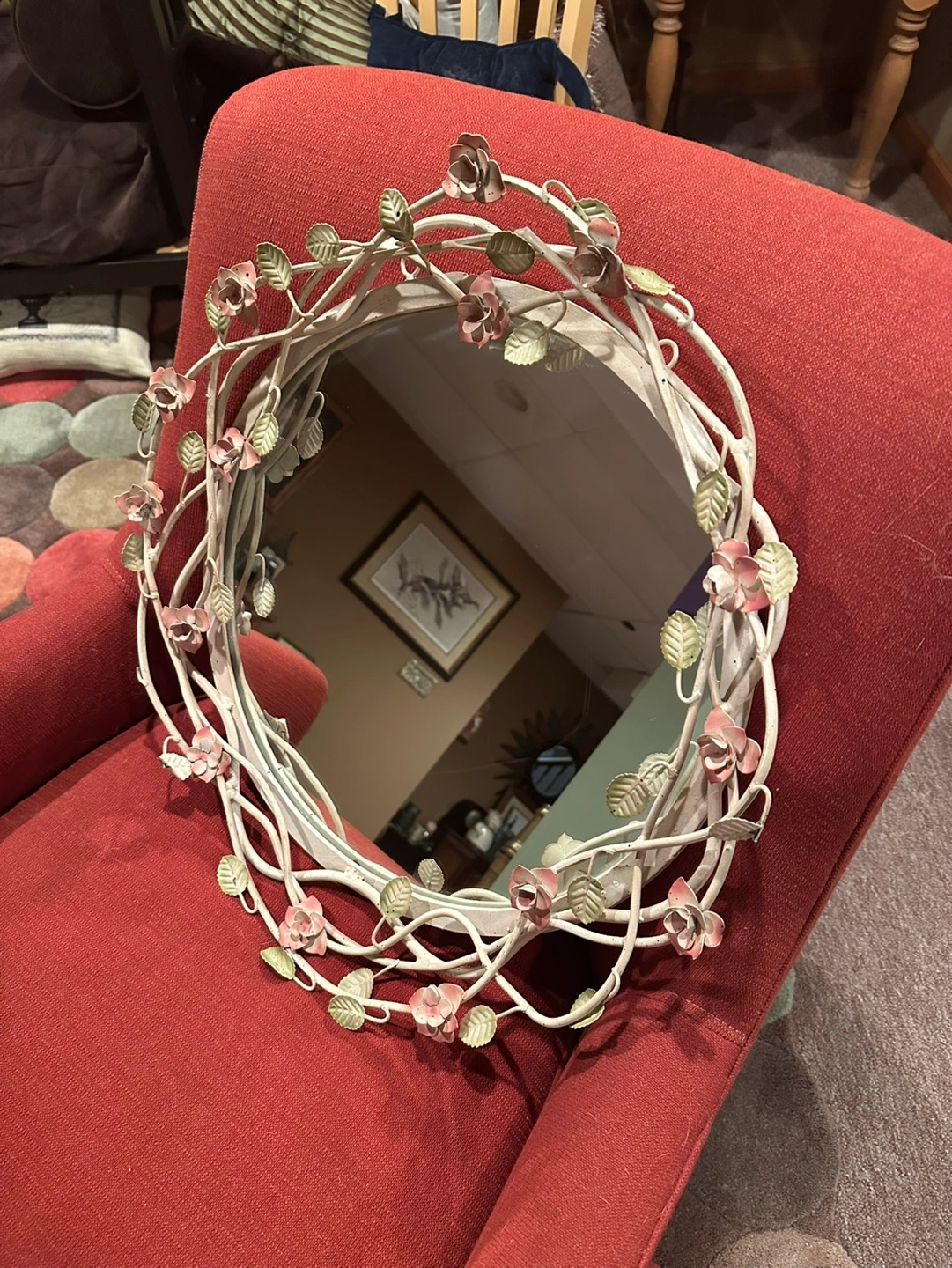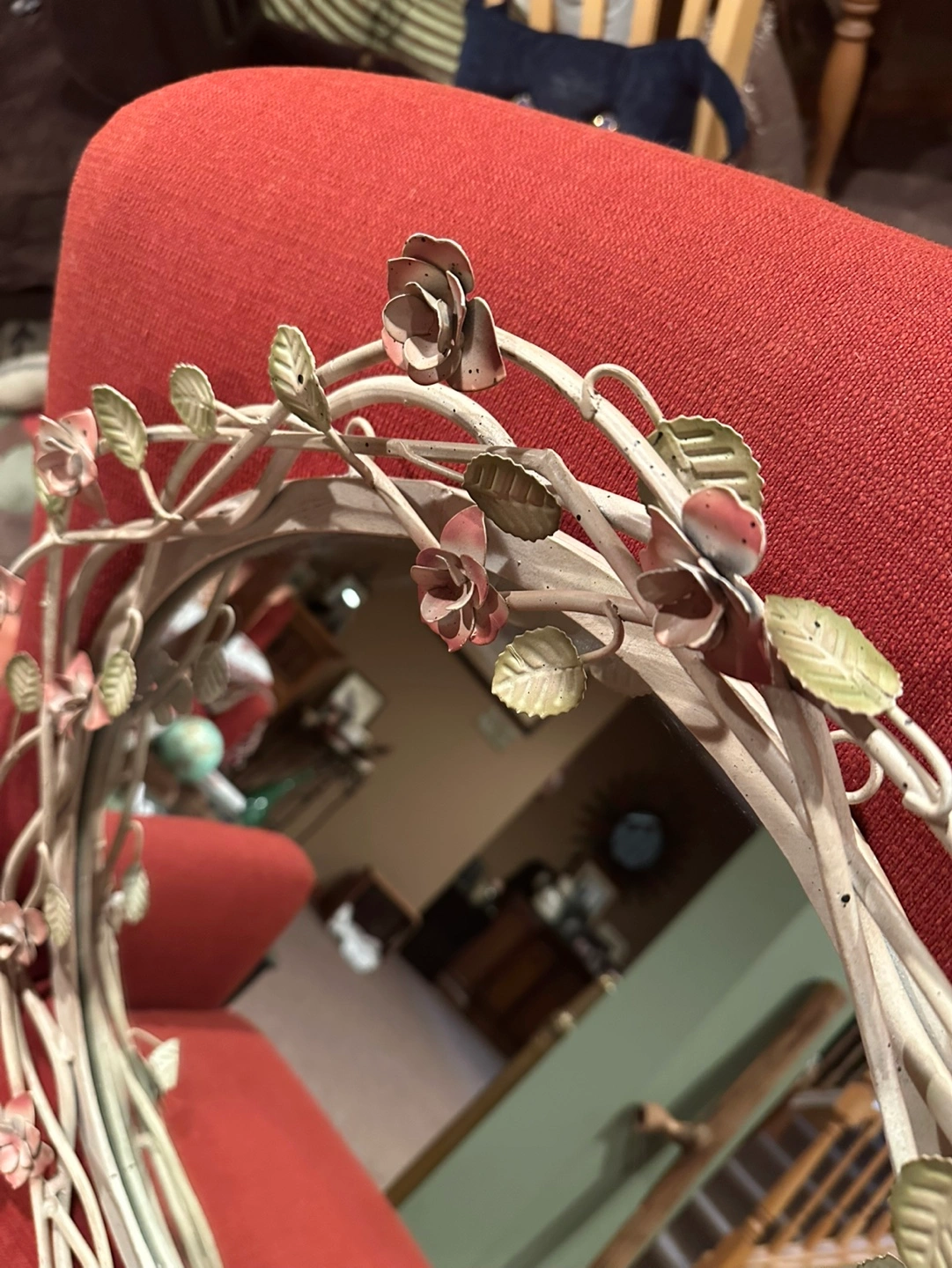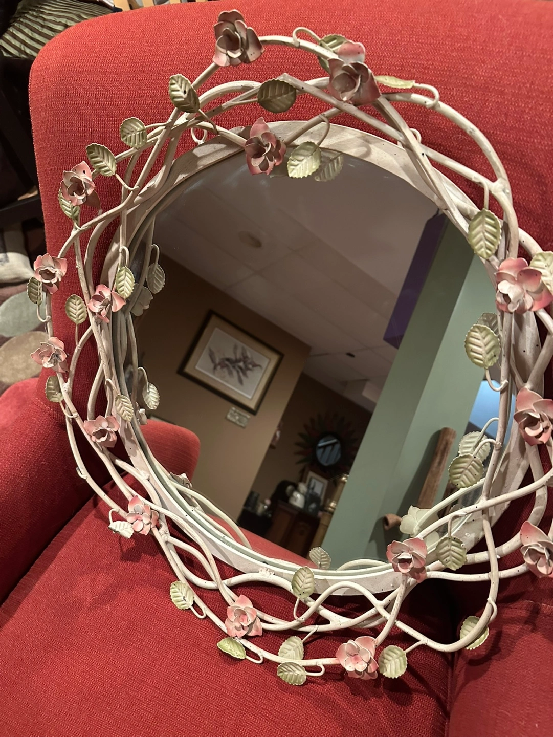 Round mirror with a metal frame. Features pink and green roses and leaves. Great for a vanity or bathroom. Wall hanging. Heavy.