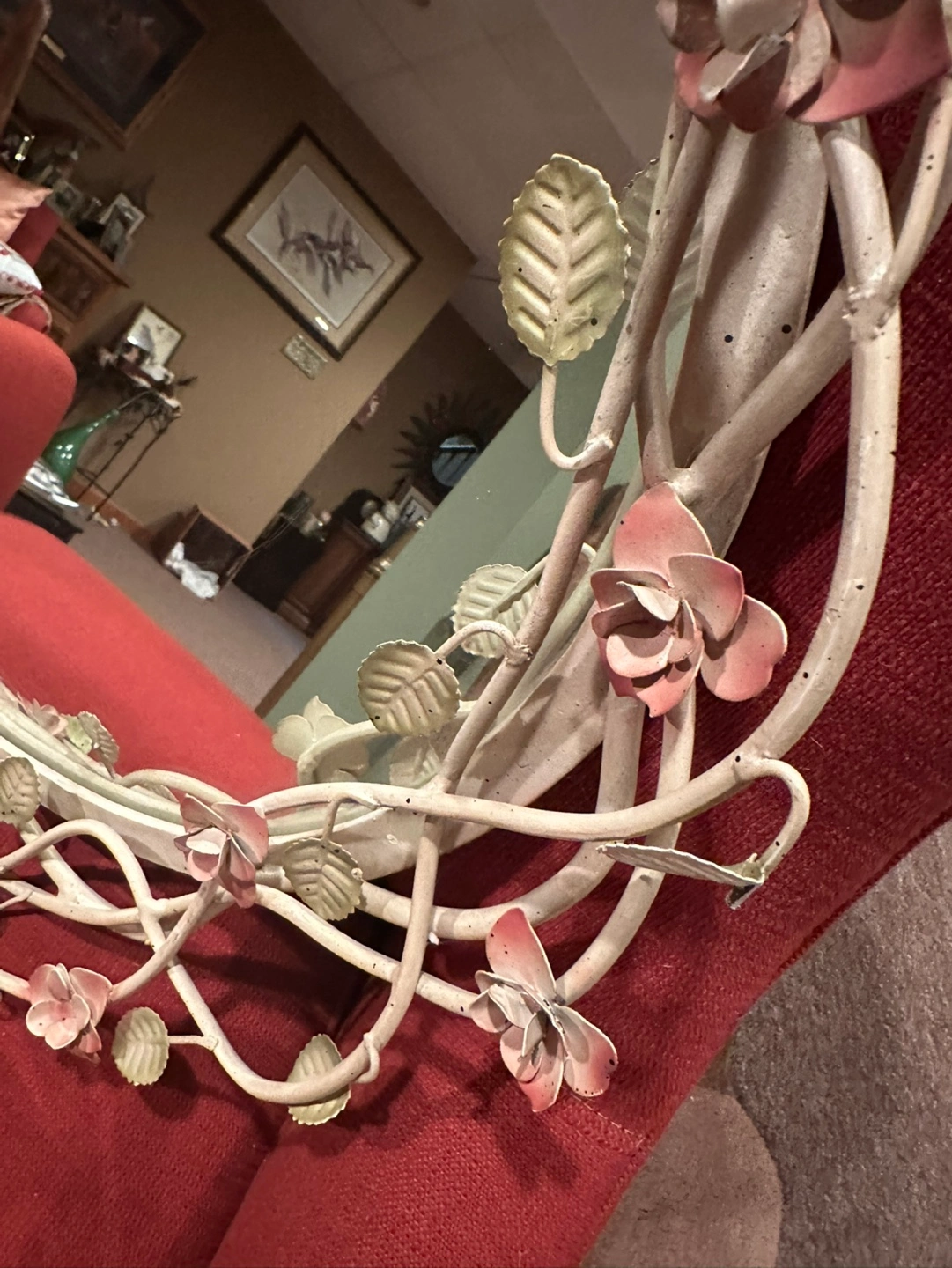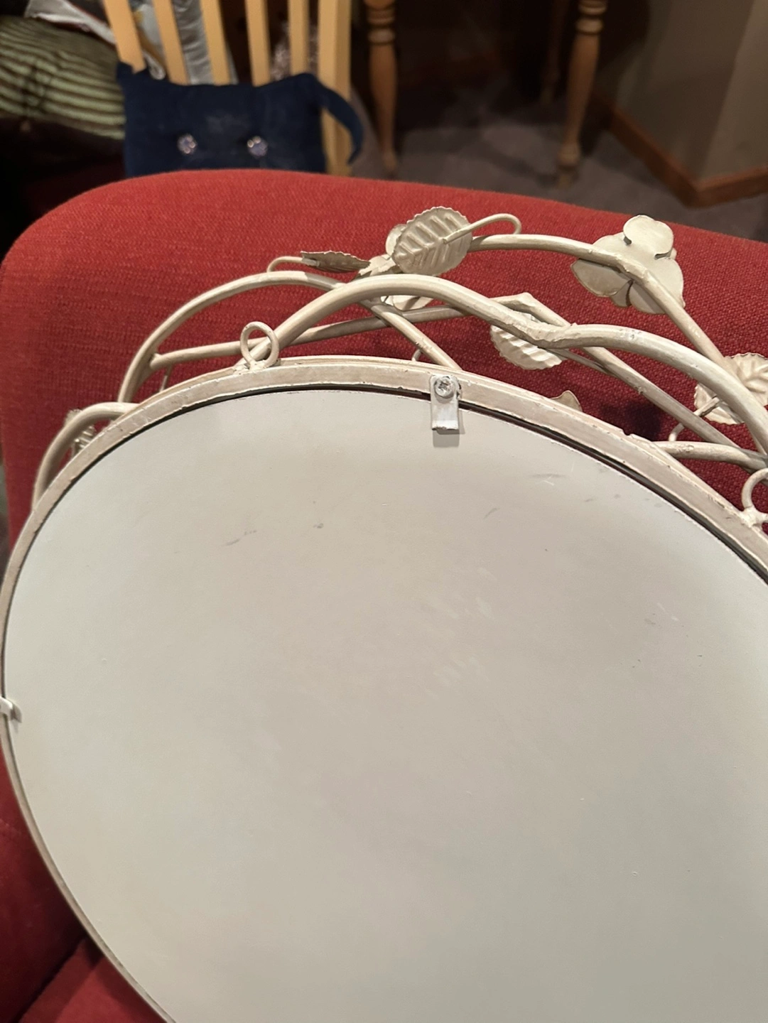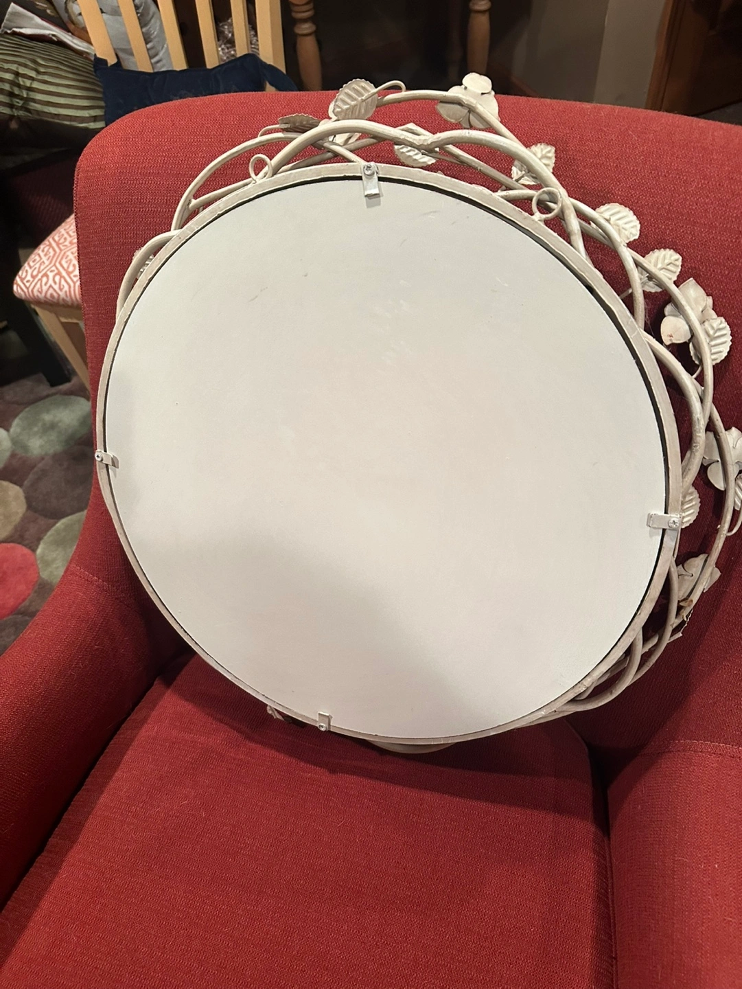 Round mirror with a metal frame. Features pink and green roses and leaves. Great for a vanity or bathroom. Wall hanging. Heavy.