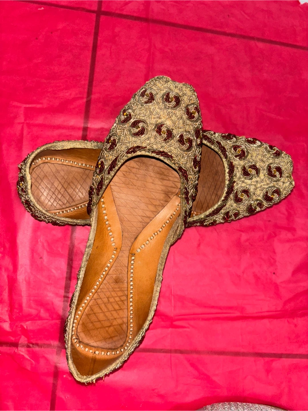 These are a pair of handmade ethnic slippers. They are in good condition and would be perfect for party/wedding wear! They are silver and gold/red. Each $20.