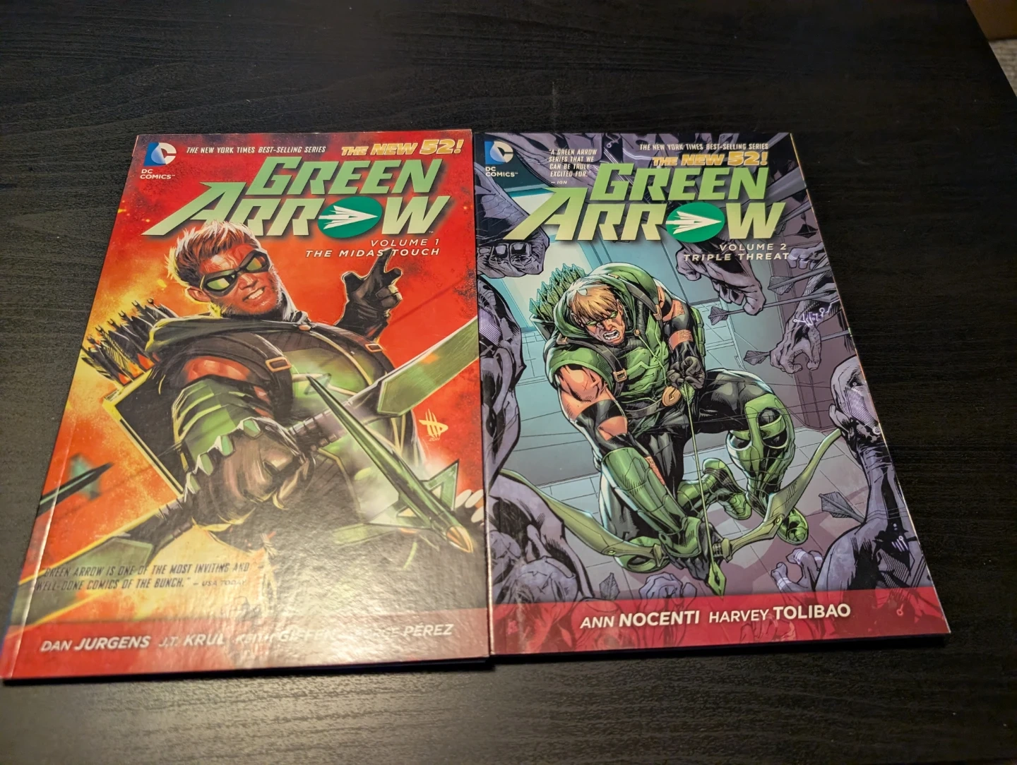 DC Comics Green Arrow "The New 52!" comic books. Volume 1 is titled "The Midas Touch" and Volume 2 is "Triple Threat." These collected editions feature thrilling adventures of the Emerald Archer. Great for comic book collectors and fans of the Green Arrow character!