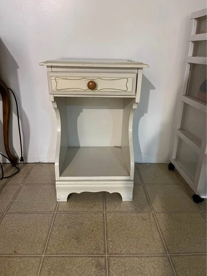 Dresser has 6 drawers and nightstand has 1 drawer with an open shelf. Both pieces have gold trim detail on drawer fronts. Dresser has mixed wooden knob and ornate metal handles. Needs some TLC. Smoke free, bug free, pet friendly.