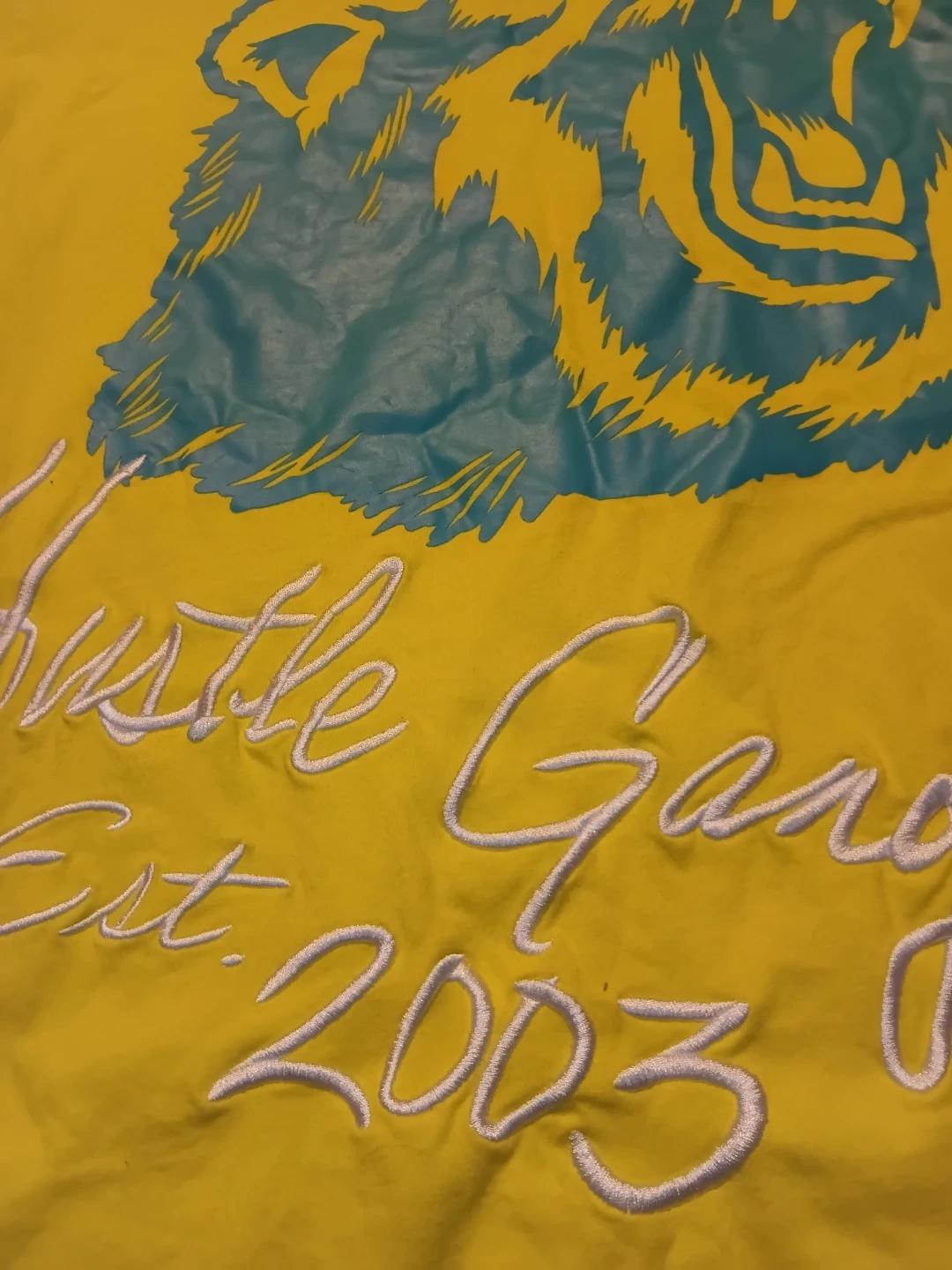This is a Hustle Gang t-shirt. It's size SM and made of cotton. Features a large graphic print on the front. .