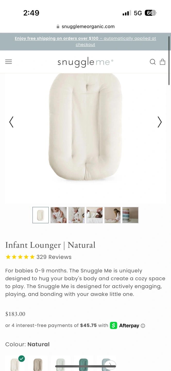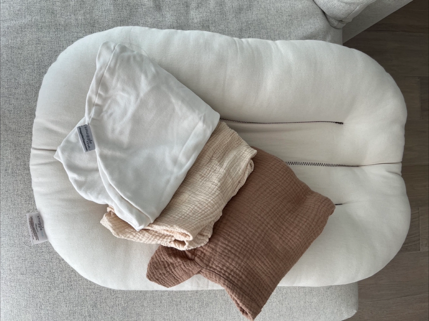 Selling a Snuggle Me lounger in natural colour with 2 extra muslin covers (purchased separately).