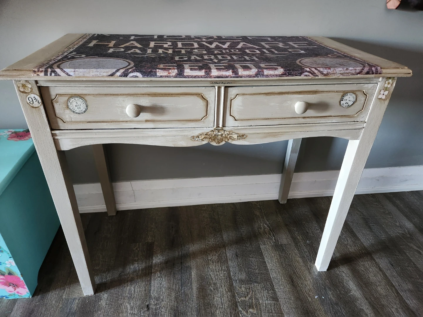 This charming desk features a vintage-inspired design with a "Homer Hardware Paints and Oils Garden Seeds" motif on the top. It has a soft grey colour matte finish and includes two drawers for storage. Perfect as a small writing desk or accent piece!