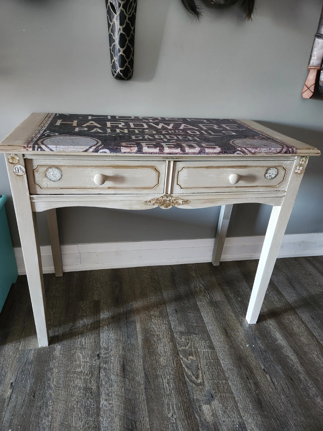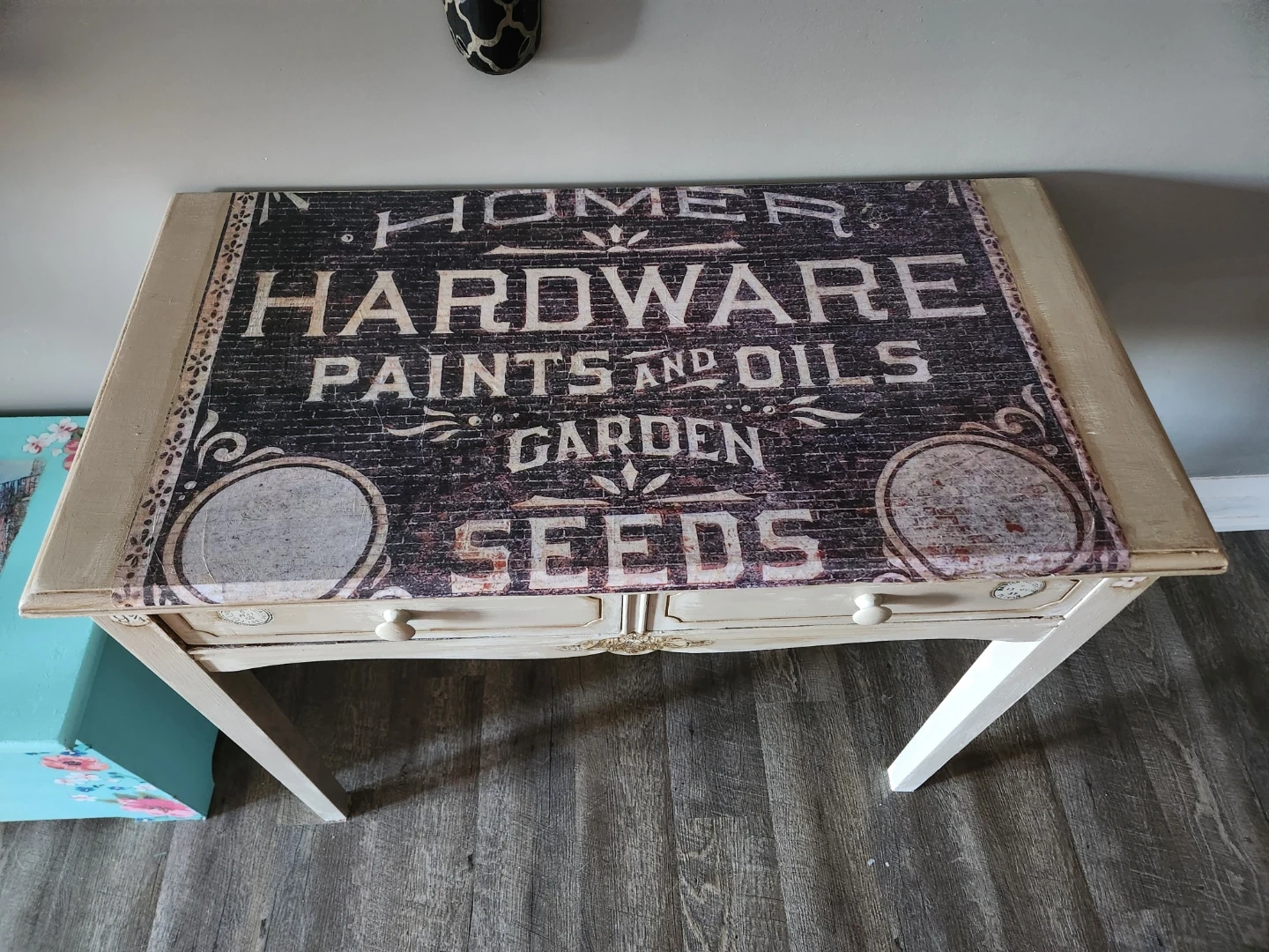This charming desk features a vintage-inspired design with a "Homer Hardware Paints and Oils Garden Seeds" motif on the top. It has a soft grey colour matte finish and includes two drawers for storage. Perfect as a small writing desk or accent piece!