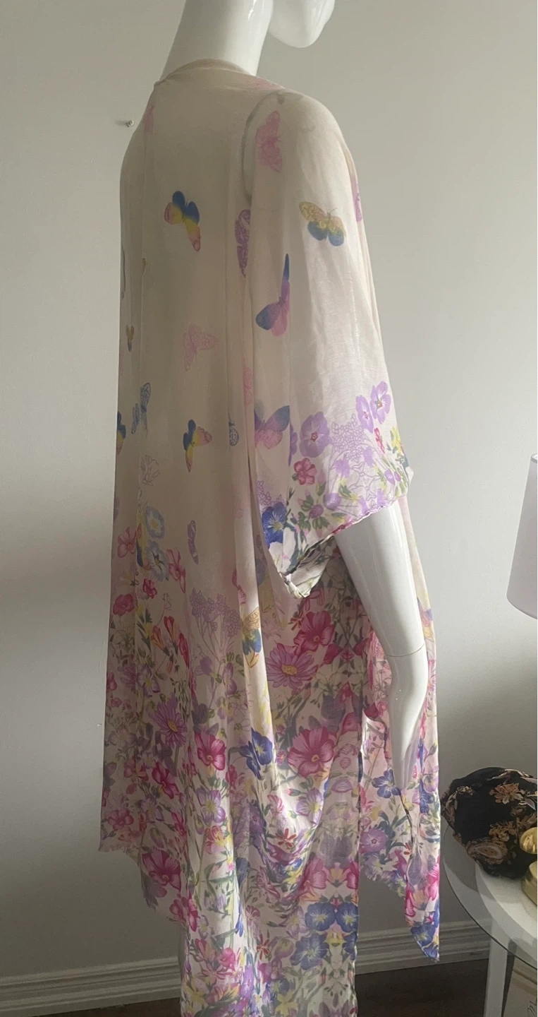 Lightweight kimono with a colourful butterfly and floral pattern. Sheer fabric with a flowy drape. Perfect for layering over outfits!