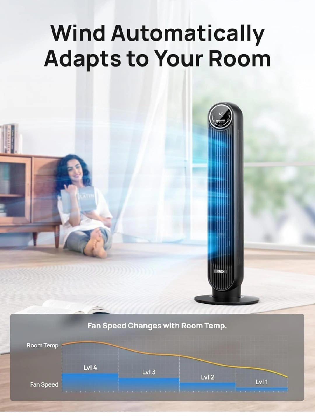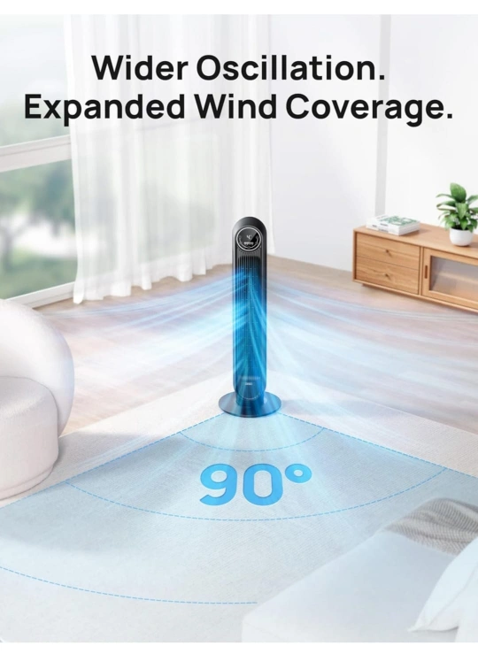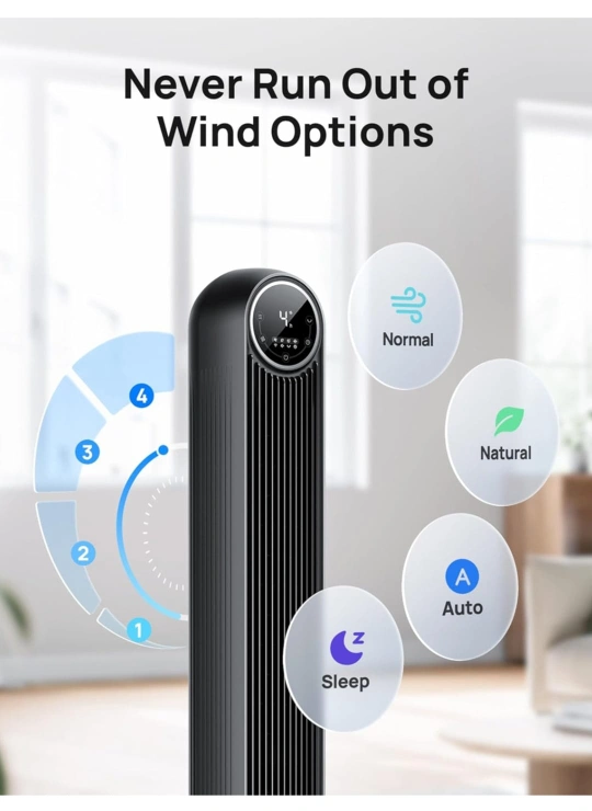 Sleek black tower fan. Multiple wind options: normal, natural, auto, and sleep modes. Easy to clean. Includes remote control. Quiet operation.