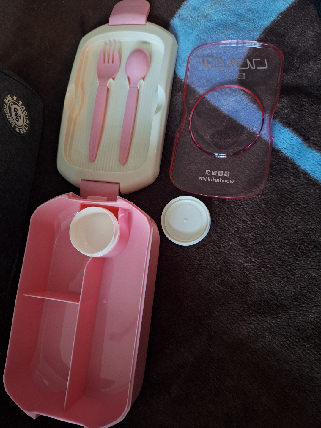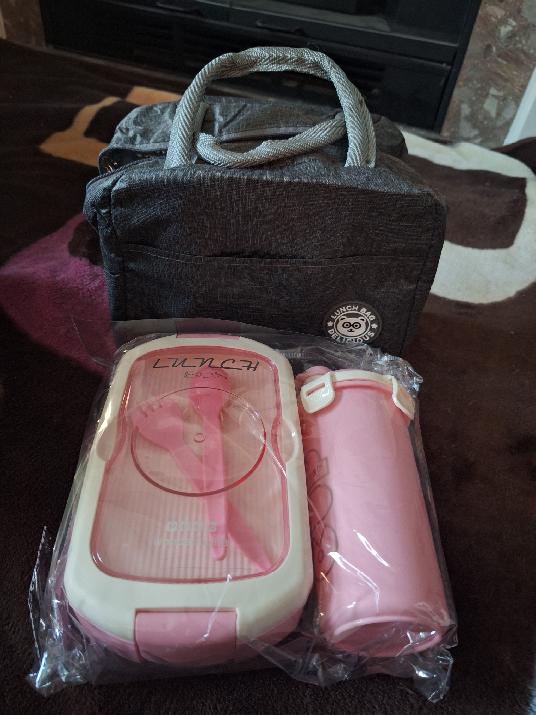 Selling a lunch bag with a cute 'Lunch Bag Delicious' logo! It comes with a pink lunchbox set including a spoon and fork, plus a matching pink water bottle. Everything is in new condition and ready for school or work lunches