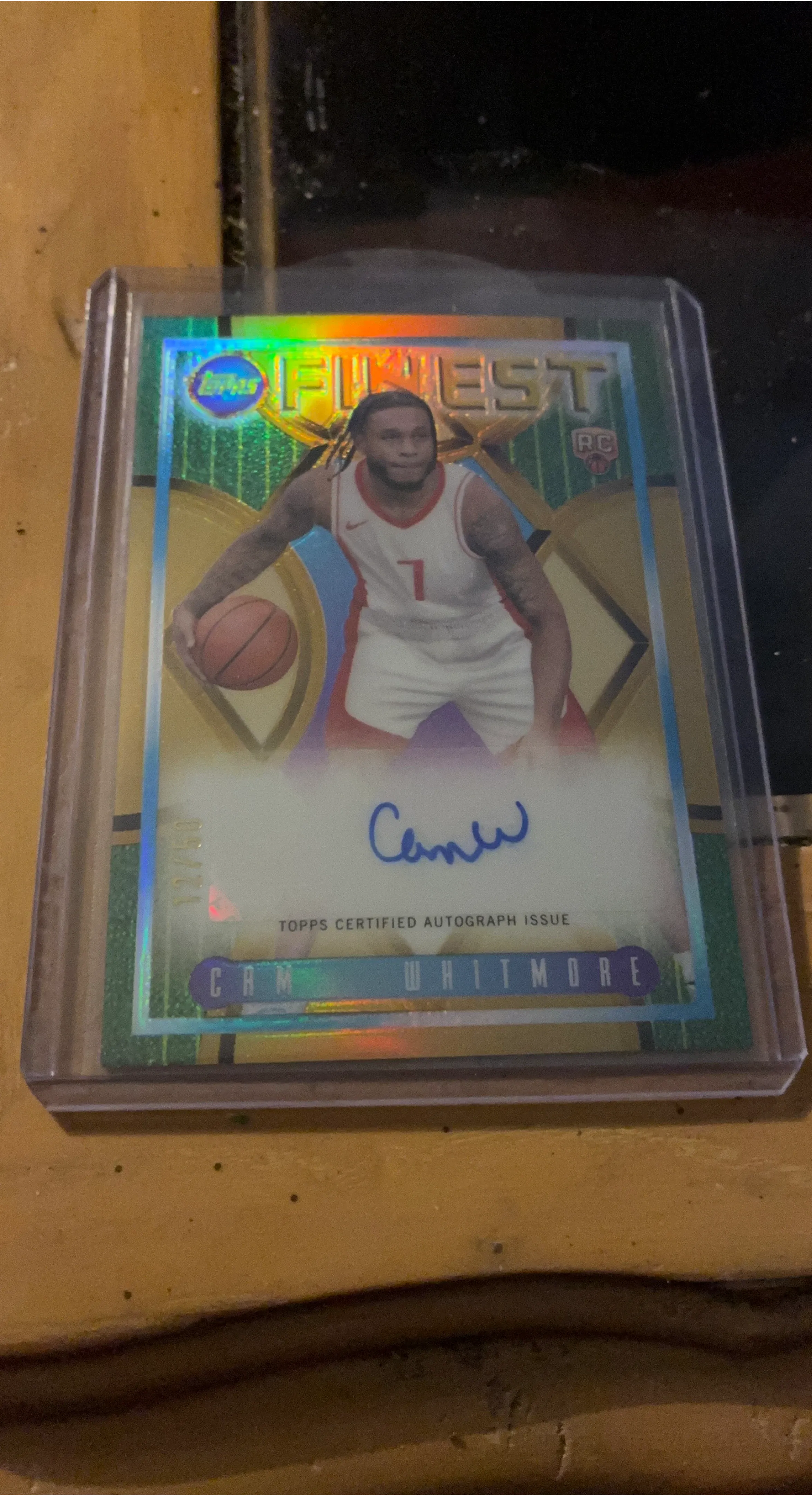 This is a 2023 Topps Finest Cam Whitmore certified autograph rookie card. It's serial numbered 12/50. This card is a great addition for any basketball collector!