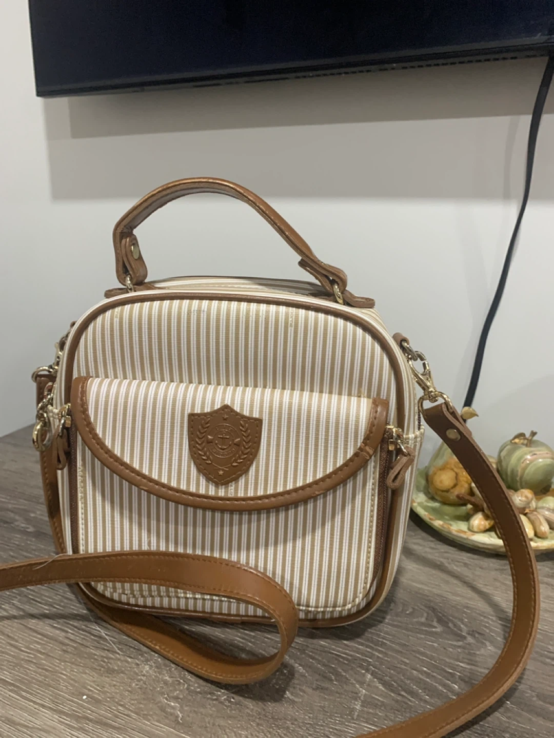 Here's a cute striped shoulder bag! It features brown leather-like accents and a structured design. It's perfect for adding a touch of vintage charm to any outfit