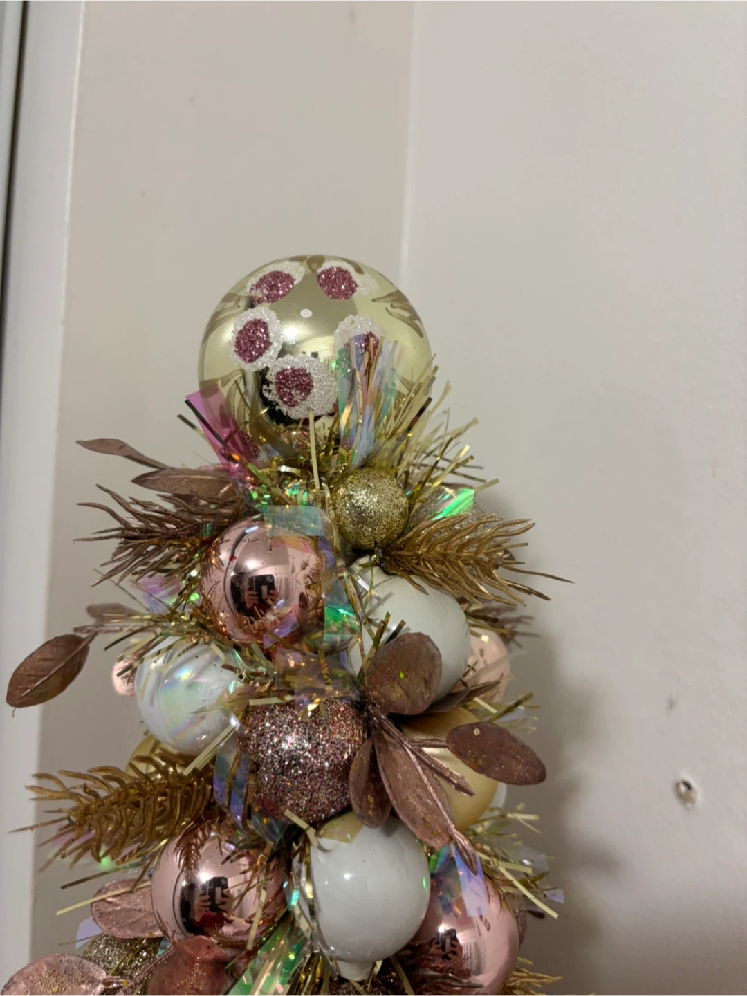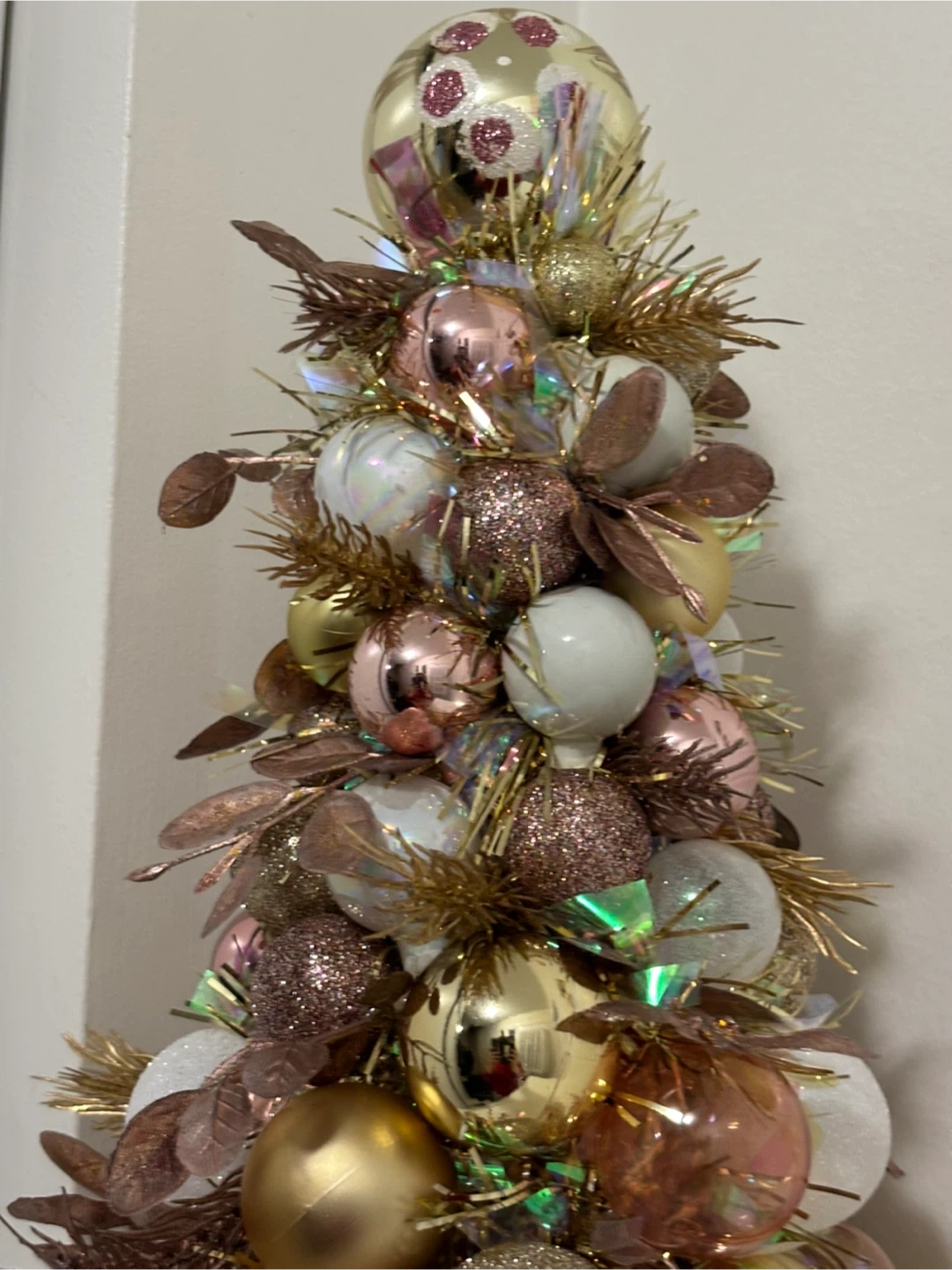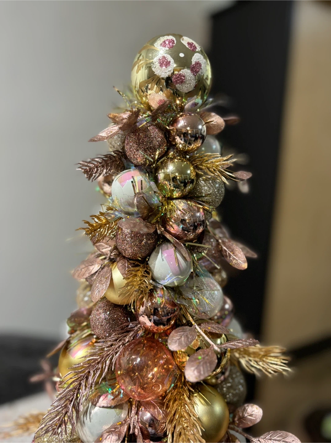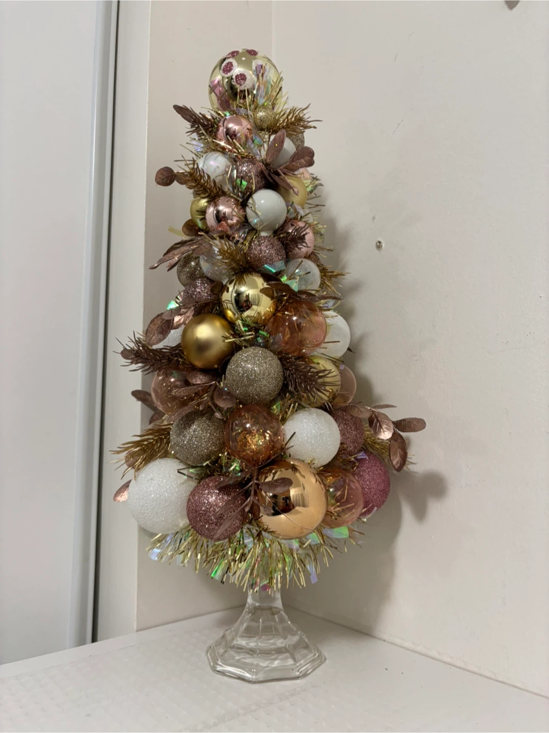 It features a variety of gold, rose gold, and white ornaments on a glass holder. Ready to go for the holidays!