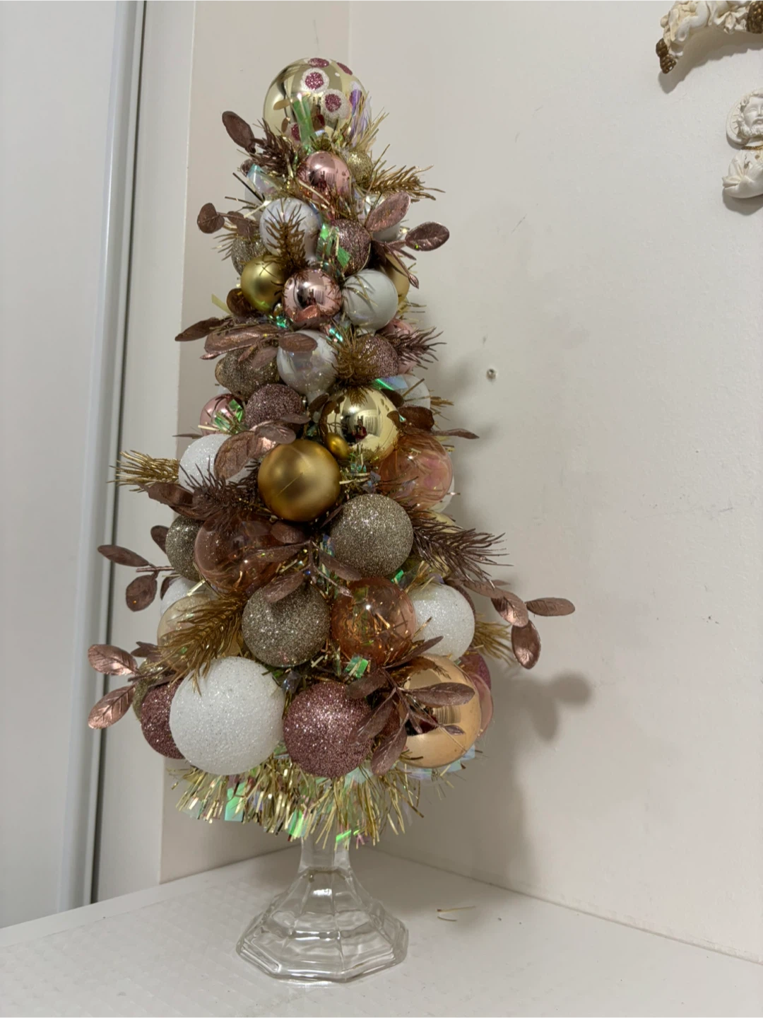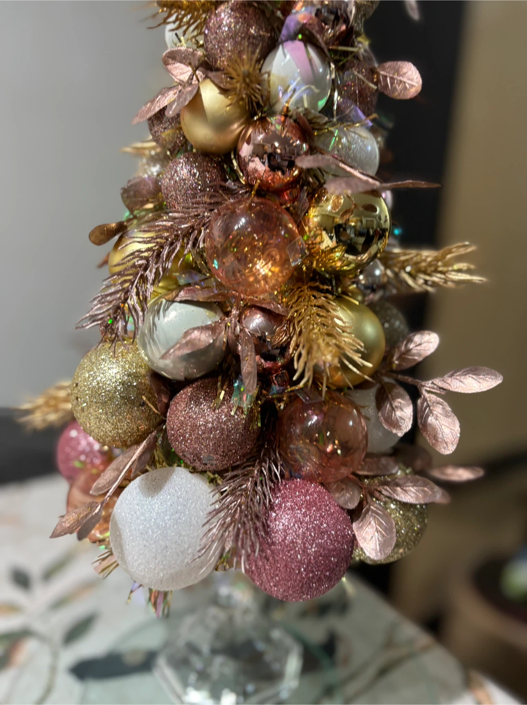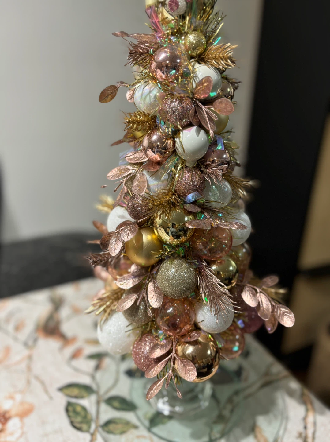 It features a variety of gold, rose gold, and white ornaments on a glass holder. Ready to go for the holidays!
