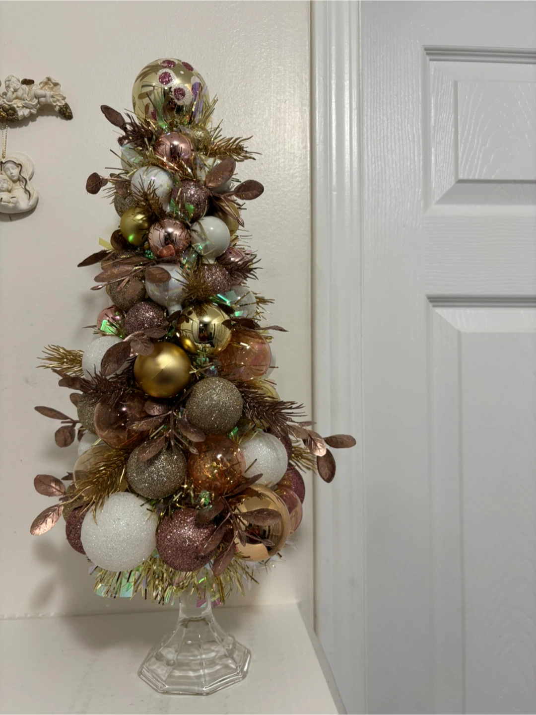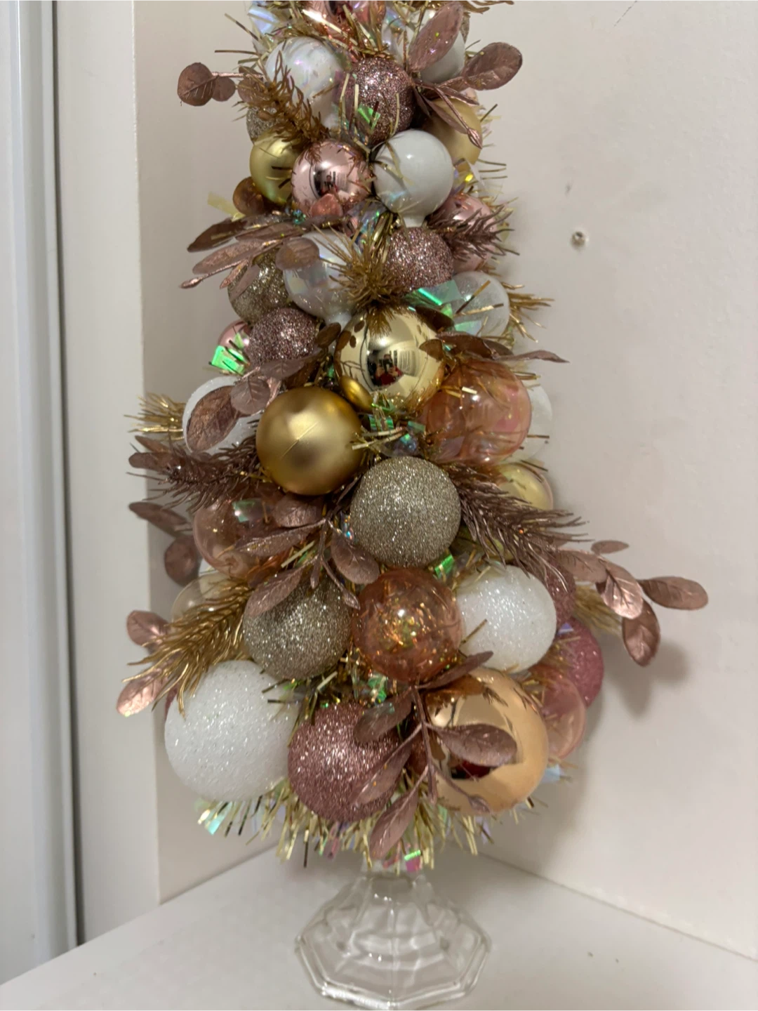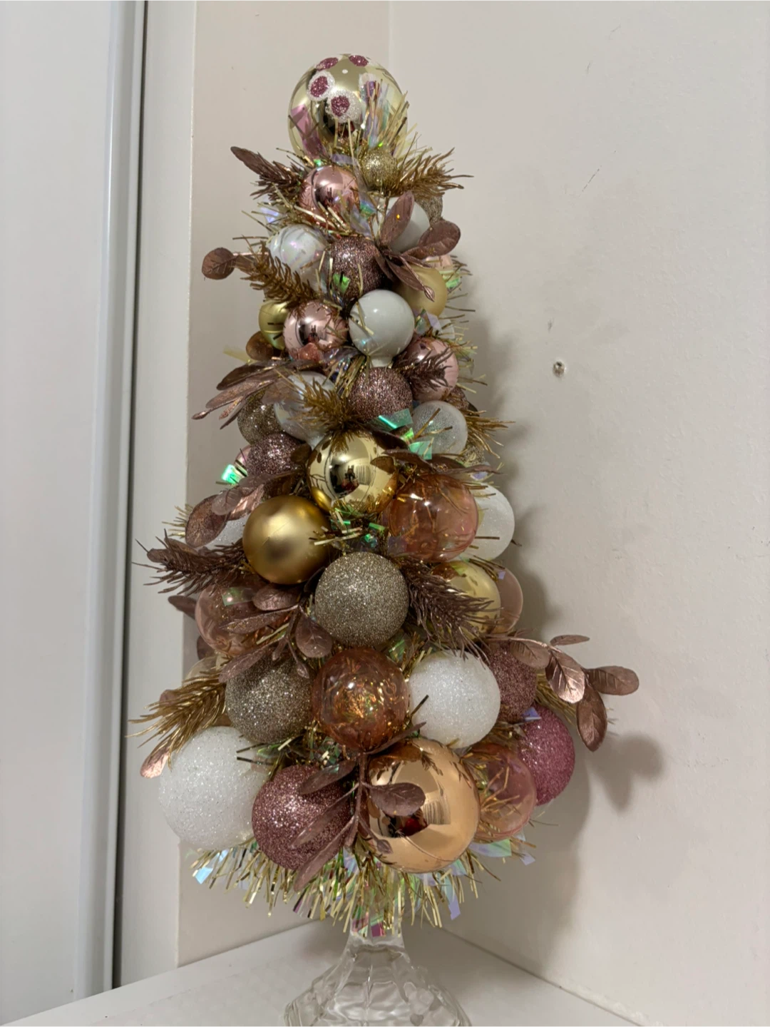 It features a variety of gold, rose gold, and white ornaments on a glass holder. Ready to go for the holidays!