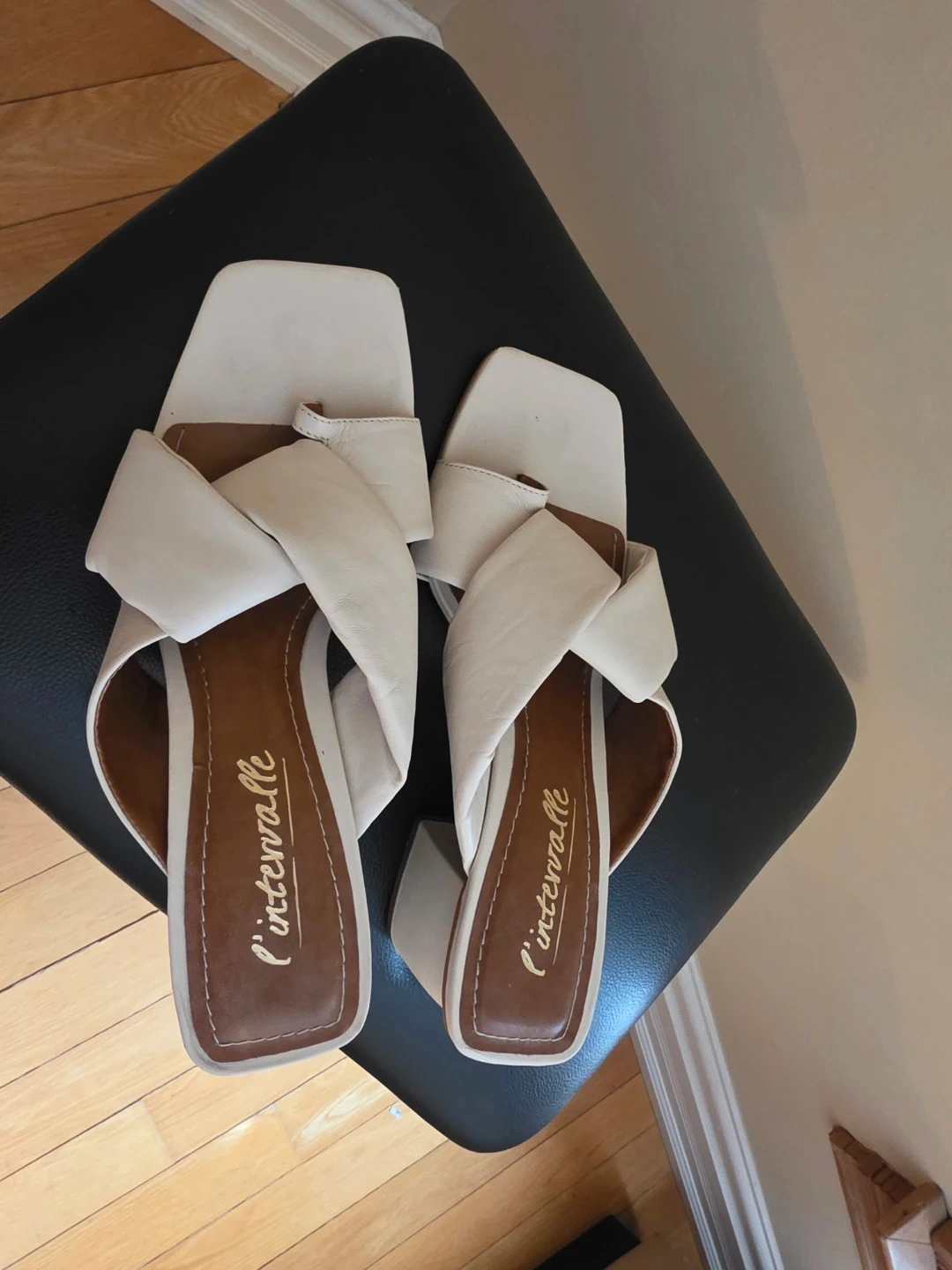 These L'Intervallle mules feature a stylish white twisted strap design. They're made with a leather upper and lining, offering a comfortable fit. The square toe adds a modern touch to these fashionable slides. Perfect for dressing up any casual outfit!