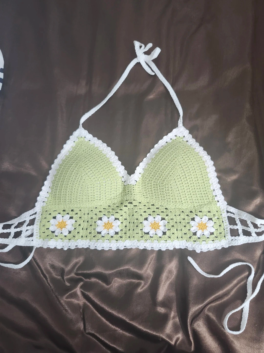 This is a handmade crocheted halter top in a light green colour. It features a white daisy pattern along the bottom hem. The top has adjustable white ties at the neck and back. This piece is perfect for warmer weather!