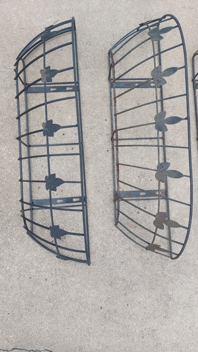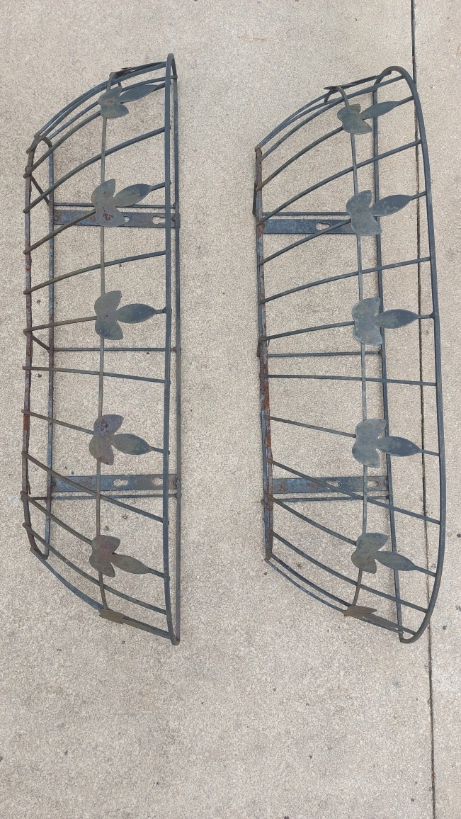 Five matching metal planter baskets. Each with a decorative leaf design. Can be mounted onto a wall or railing.