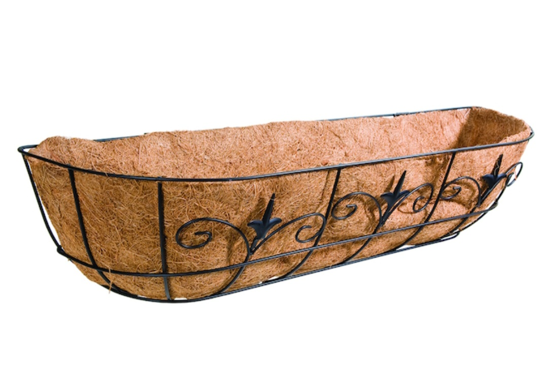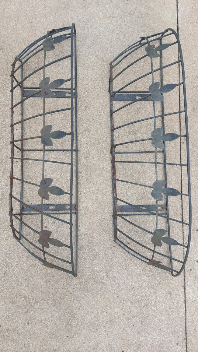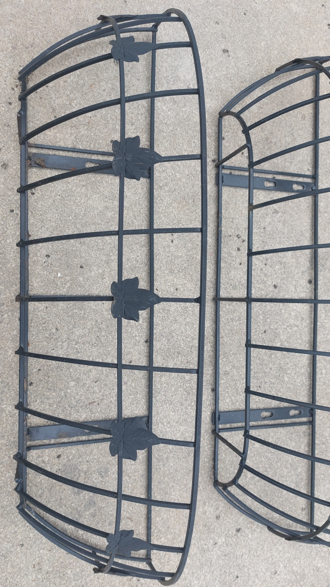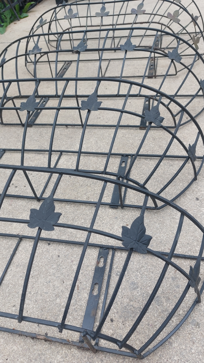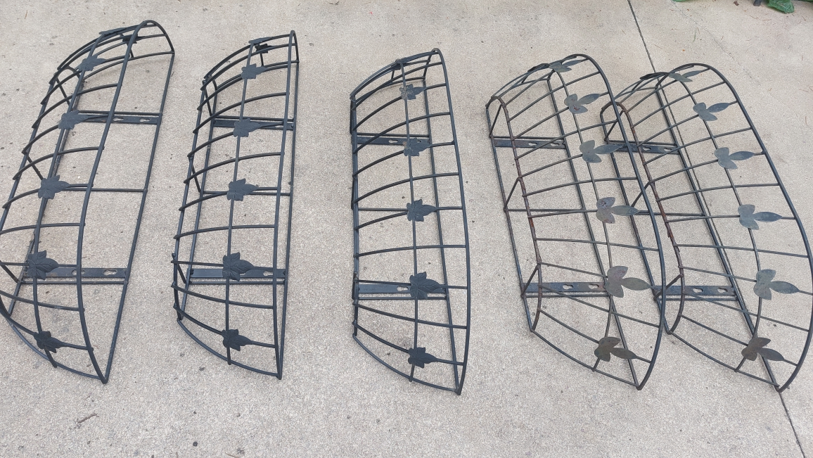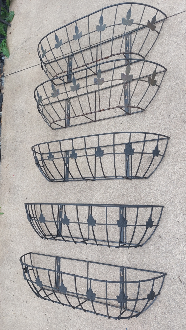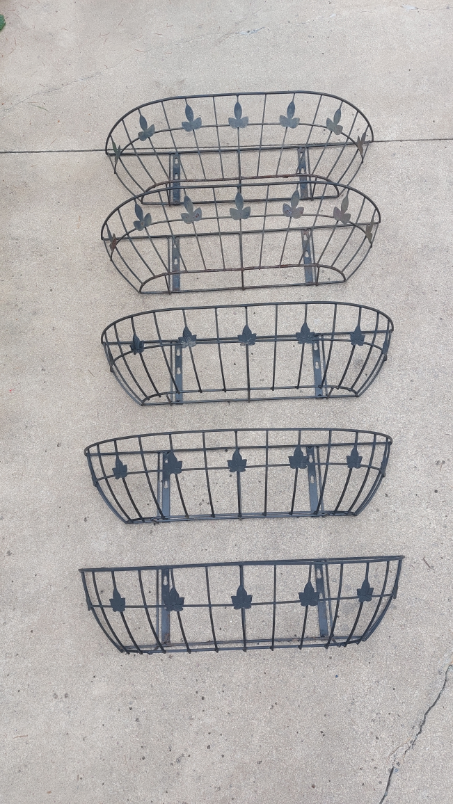 Five matching metal planter baskets. Each with a decorative leaf design. Can be mounted onto a wall or railing.