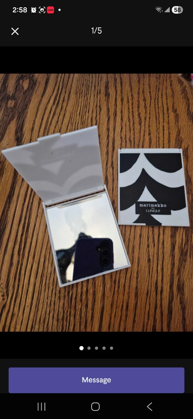 A handy compact mirror with a Marimekko for Clinique design. White plastic casing. Free gift with $10 purchase of Clinique