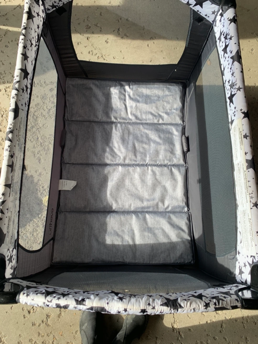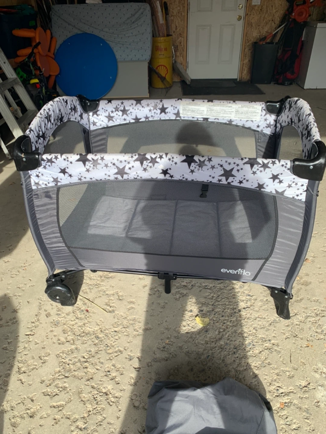 This Evenflo portable playard features a grey and black star pattern. It's easy to set up and take down for on-the-go use. The mesh sides provide ventilation. Also come with canopy.
