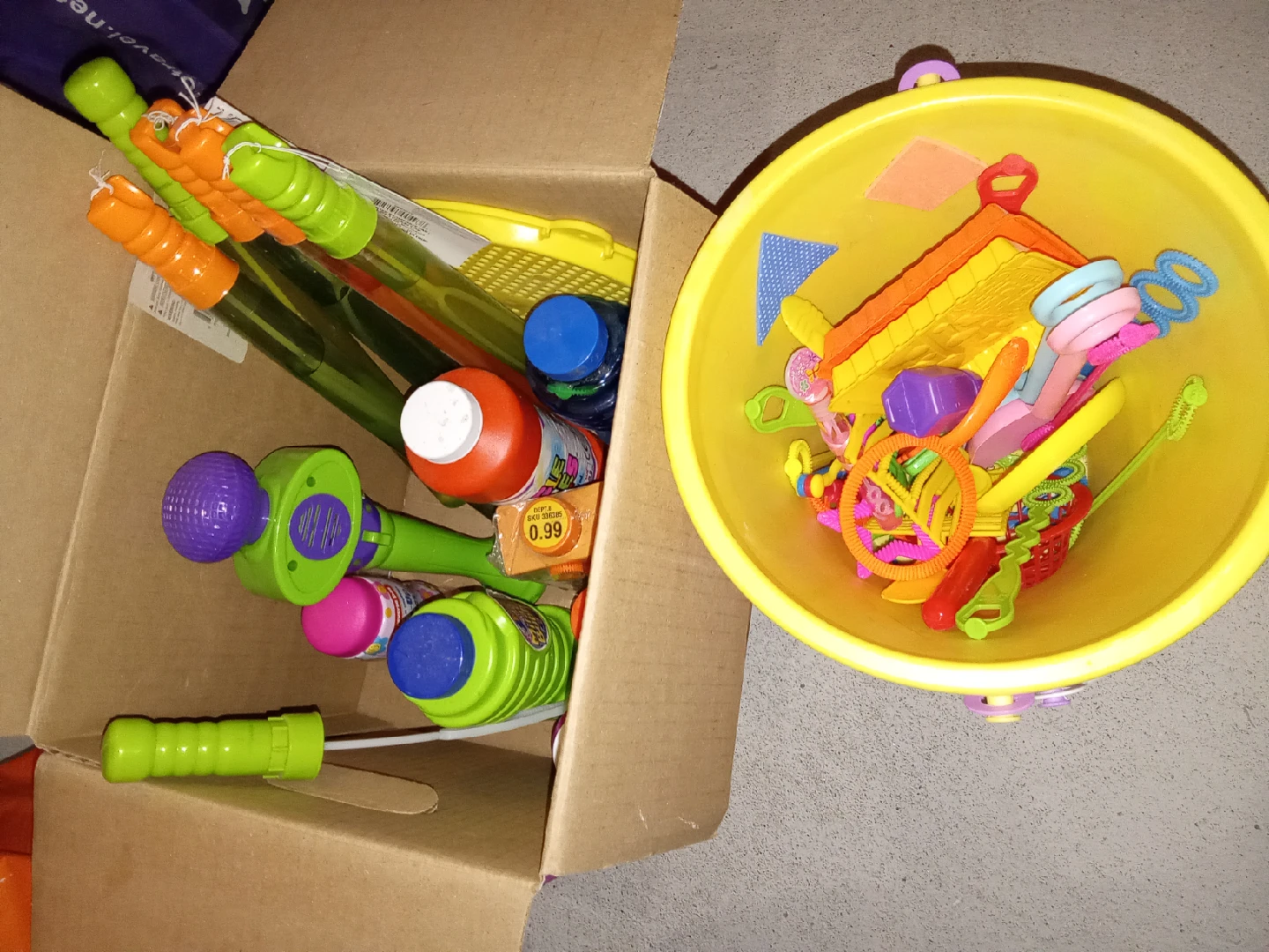 Selling a collection of bubble wands and bucket toys! Great for outdoor fun and keeping the kids entertained. Includes various bubble wands and a bucket full of assorted toys