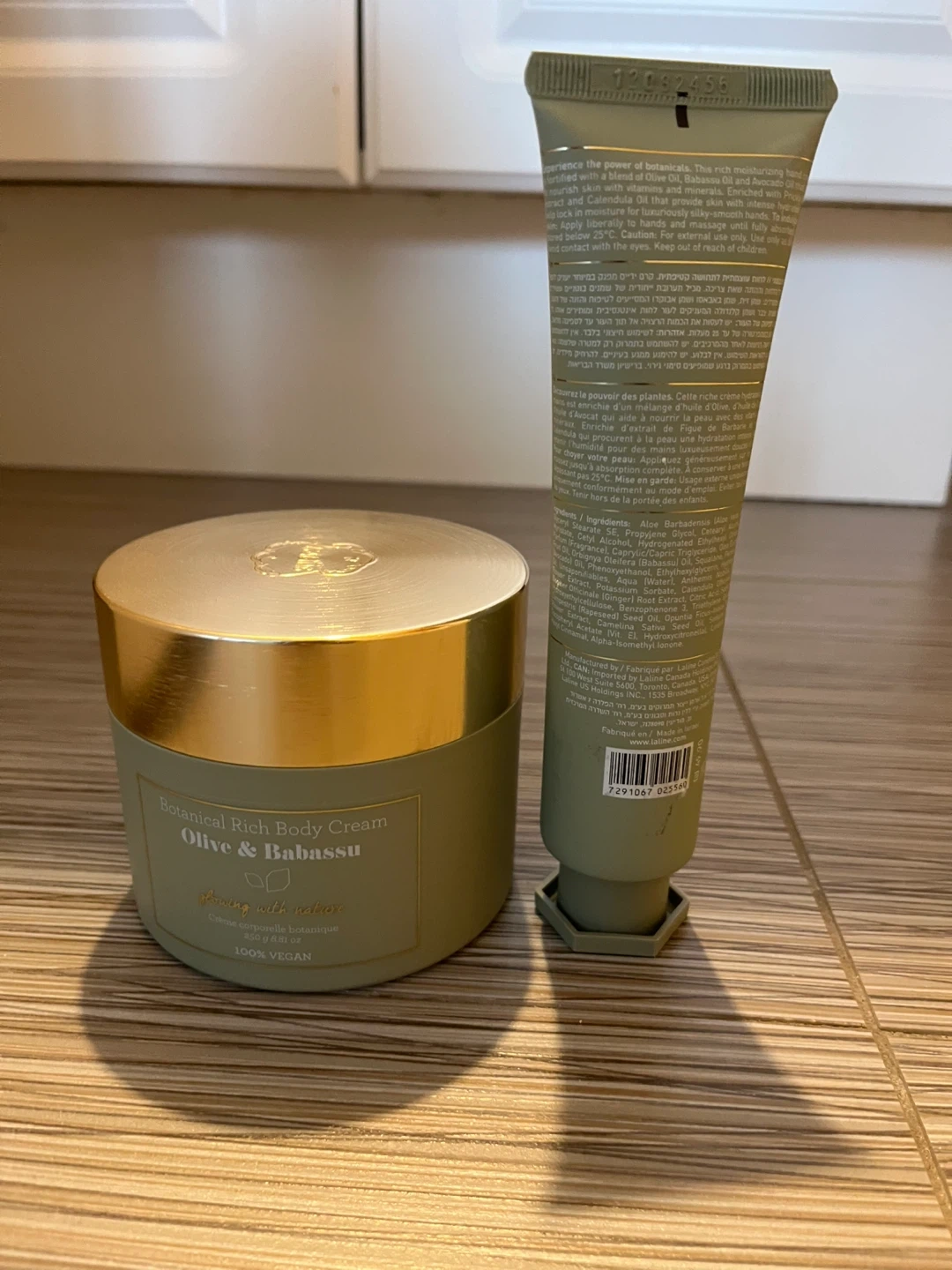 Set includes Laline Botanical Hand Cream and Botanical Rich Body Cream in Olive & Babassu scent. Both are 100% vegan. The hand cream is 100 g/3.5 oz and the body cream is 200 g/6.8 fl oz. Perfect for keeping skin moisturized!