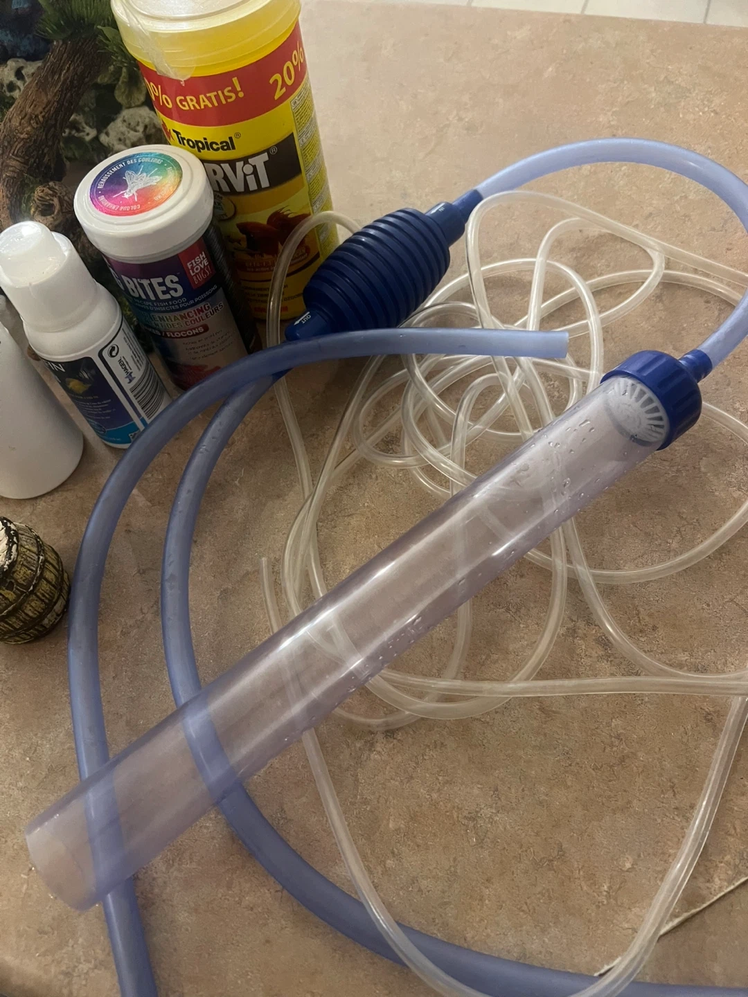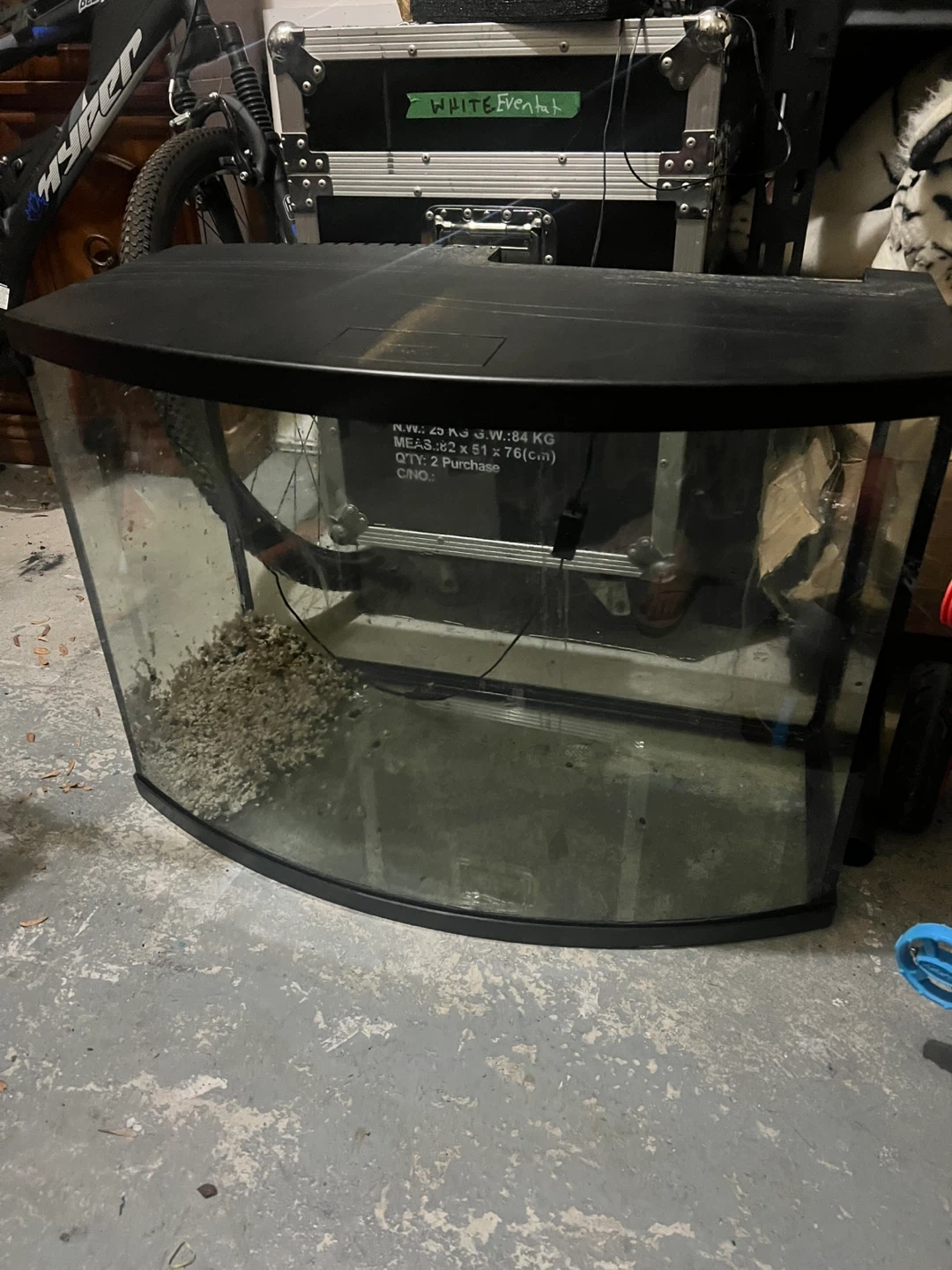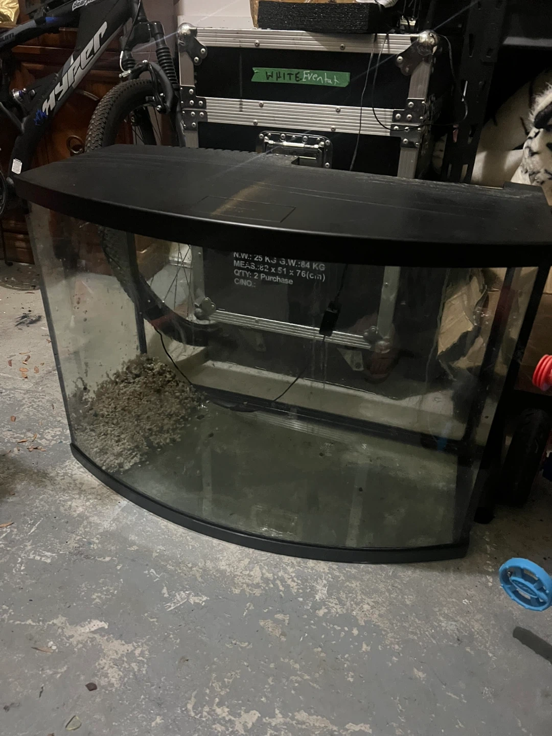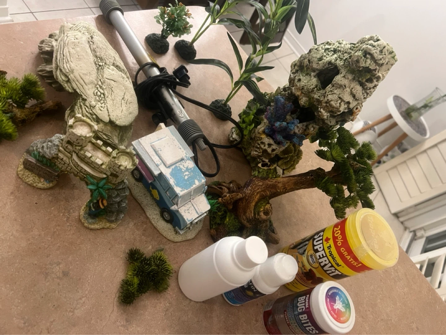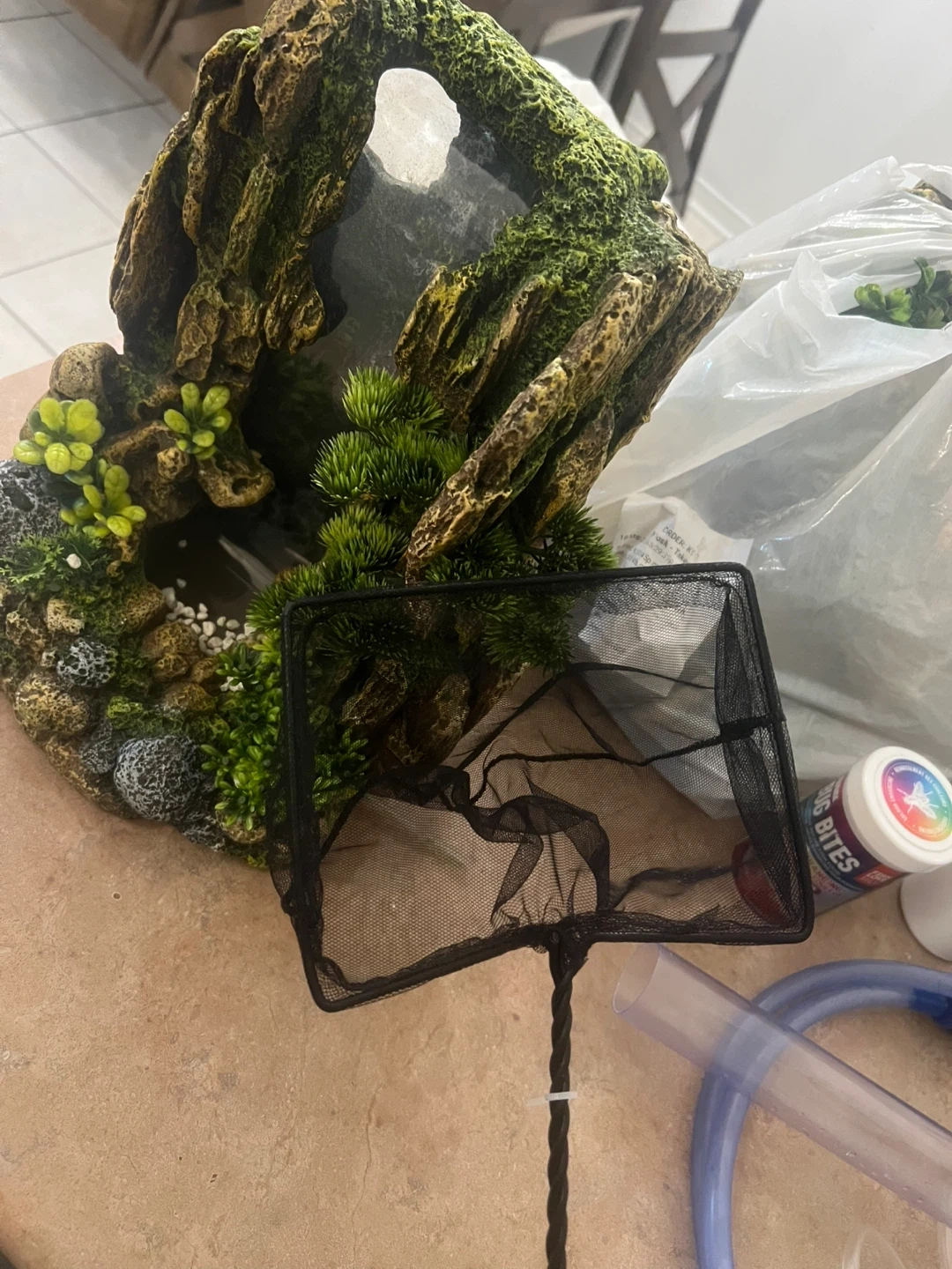 This is a curved aquarium tank. It comes with various decorations, including artificial plants and rock formations. Also included are fish food, a net, and a water conditioner. It's perfect for setting up a small aquatic environment at home!