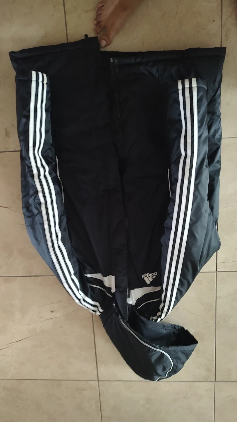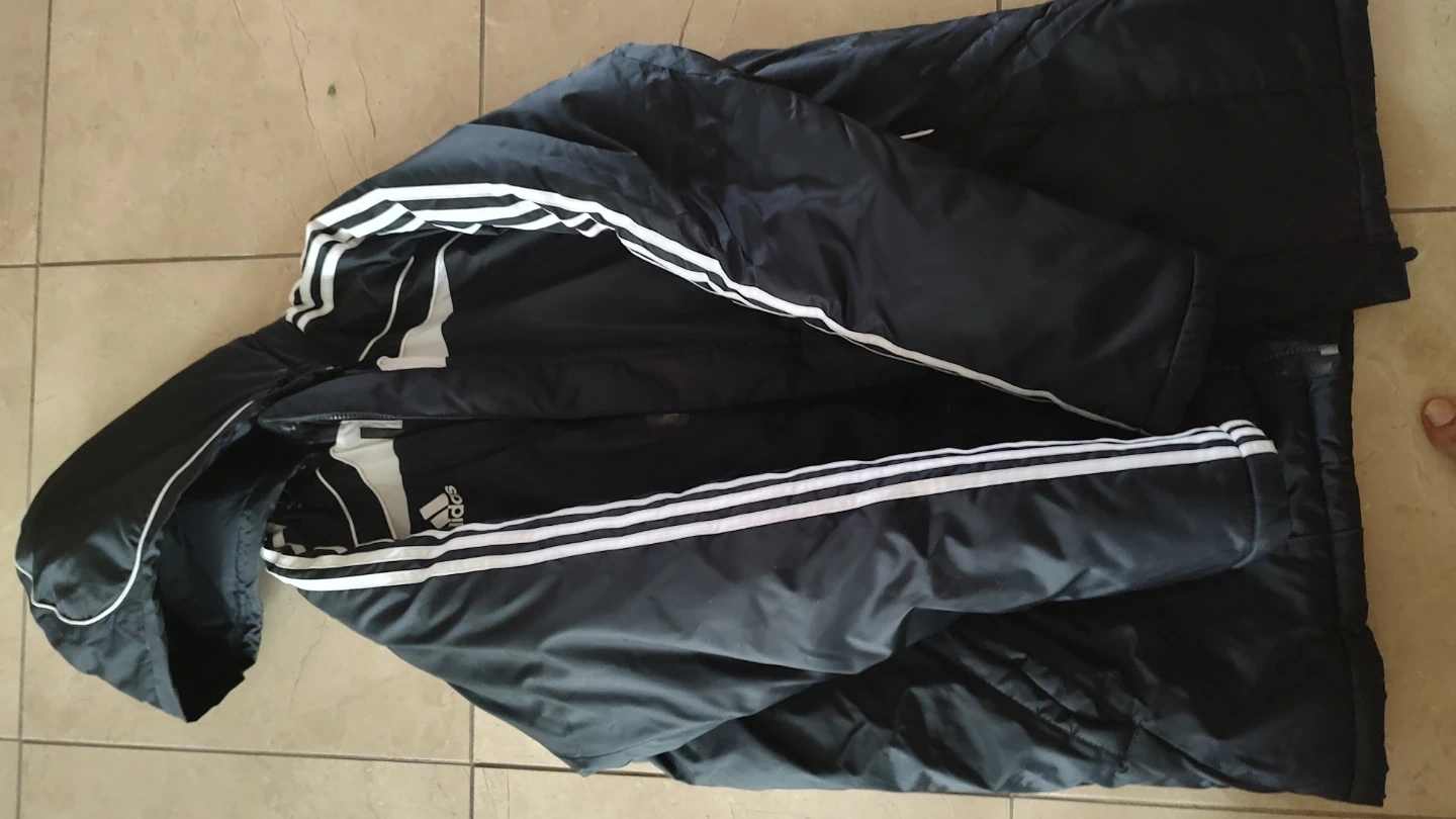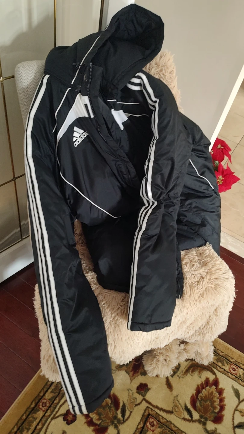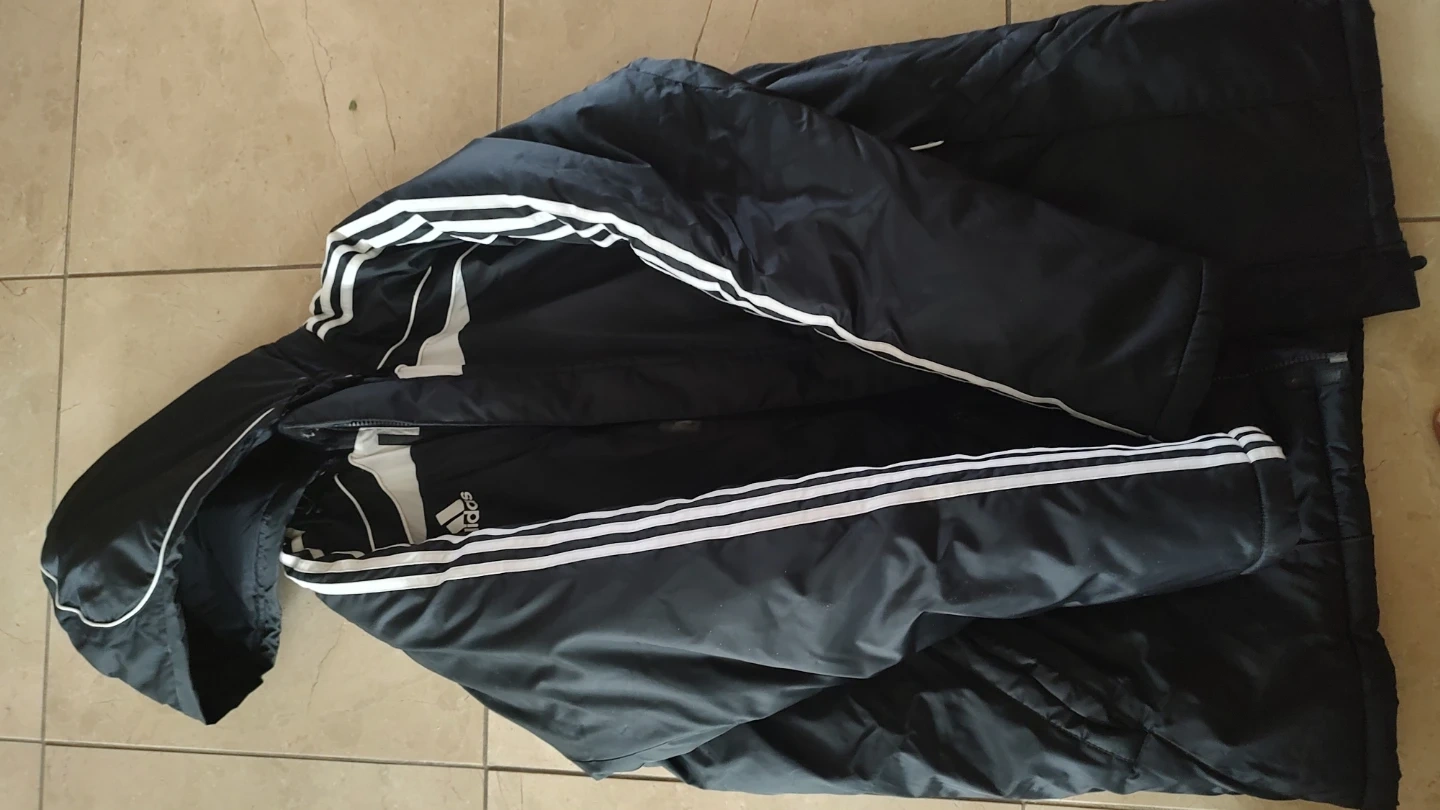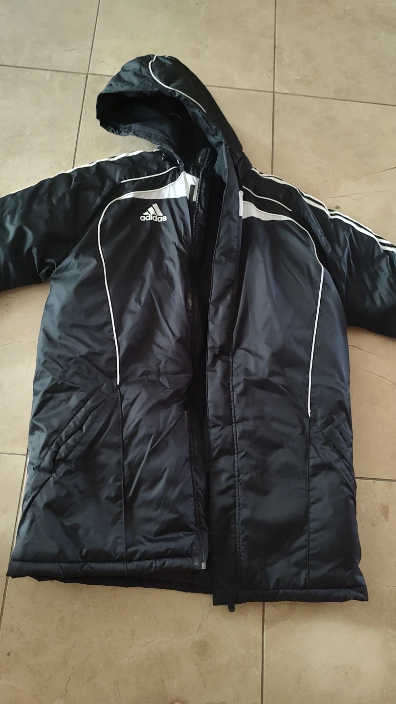 This is a black Adidas winter jacket with white stripe detailing. It features a full zip closure and a hood. This jacket is great for staying warm in colder weather.