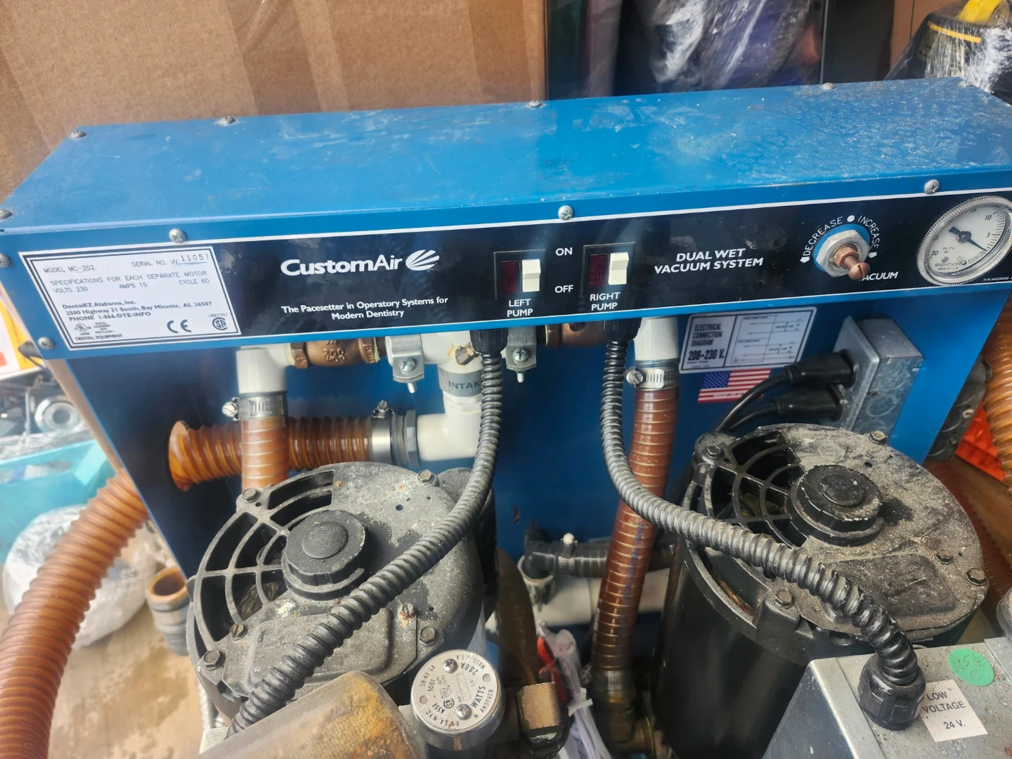 This is a CustomAir MC-202 dual wet vacuum system, designed for modern dentistry operatory systems. It runs on 230 volts and draws 15 amps per motor. The vacuum system has controls for left and right pumps, with a gauge to monitor vacuum levels.